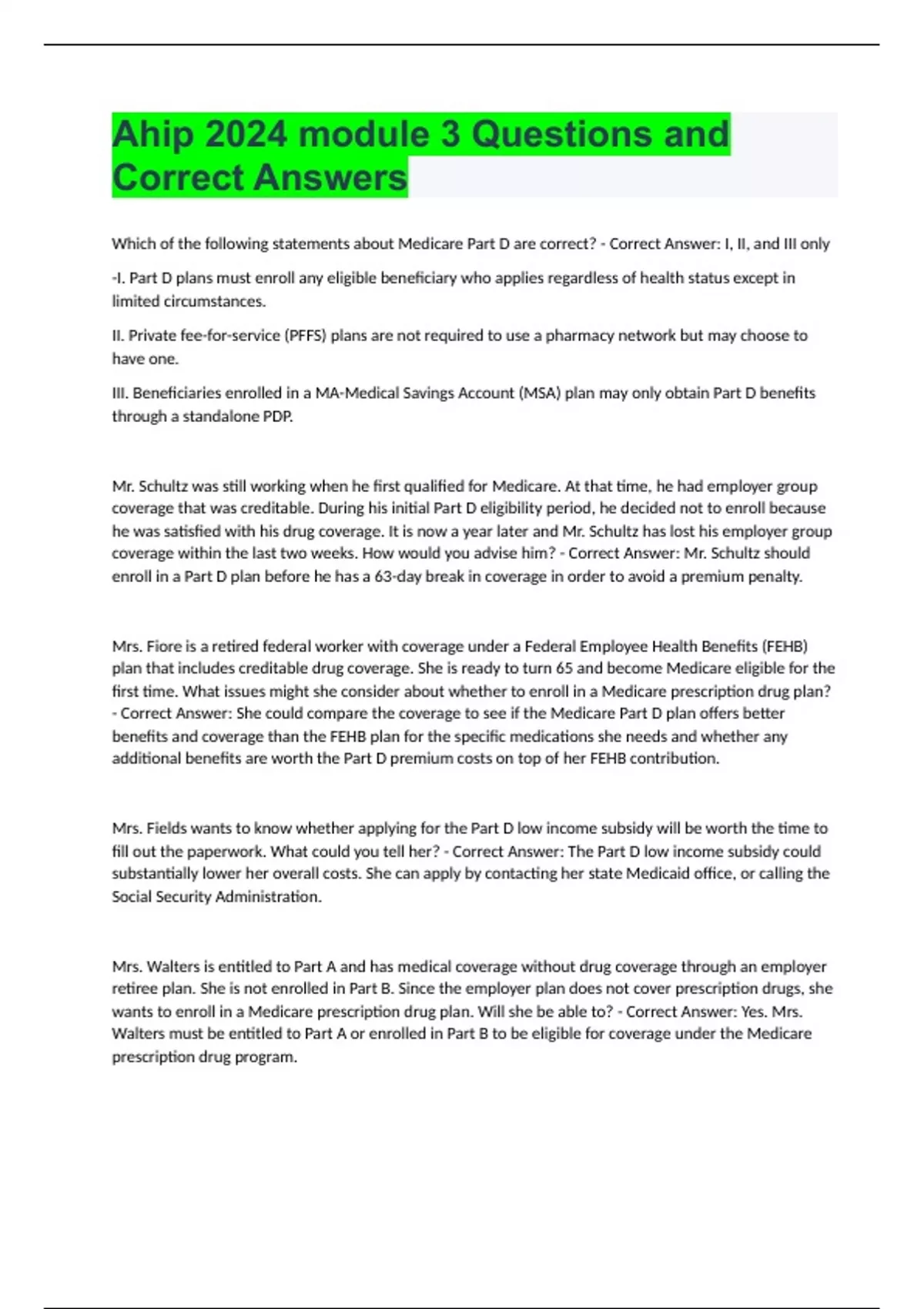 Ahip 2024 module 3 Questions and Correct Answers Which of the following statements about Medicare Part D are correct? - Correct Answer: I, II, and III only -I. Part D plans must enroll any eligible beneficiary who applies regardless of health status except in limited circumstances. II. Private fee-for-service (PFFS) plans are not required to use a pharmacy network but may choose to have one. III. Beneficiaries enrolled in a MA-Medical Savings Account (MSA) plan may only obtain Part D benefits through a standalone PDP. Mr. Schultz was still working when he first qualified for Medicare. At that time, he had employer group coverage that was creditable. During his initial Part D eligibility period, he decided not to enroll because he was satisfied with his drug coverage. It is now a year later and Mr. Schultz has lost his employer group coverage within the last two weeks. How would you advise him? - Correct Answer: Mr. Schultz should enroll in a Part D plan before he has a 63-day break in coverage in order to avoid a premium penalty. Mrs. Fiore is a retired federal worker with coverage under a Federal Employee Health Benefits (FEHB) plan that includes creditable drug coverage. She is ready to turn 65 and become Medicare eligible for the first time. What issues might she consider about whether to enroll in a Medicare prescription drug plan? - Correct Answer: She could compare the coverage to see if the Medicare Part D plan offers better benefits and coverage than the FEHB plan for the specific medications she needs and whether any additional benefits are worth the Part D premium costs on top of her FEHB contribution. Mrs. Fields wants to know whether applying for the Part D low income subsidy will be worth the time to fill out the paperwork. What could you tell her? - Correct Answer: The Part D low income subsidy could substantially lower her overall costs. She can apply by contacting her state Medicaid office, or calling the Social Security Administration. Mrs. Walters is entitled to Part A and has medical coverage without drug coverage through an employer retiree plan. She is not enrolled in Part B. Since the employer plan does not cover prescription drugs, she wants to enroll in a Medicare prescription drug plan. Will she be able to? - Correct Answer: Yes. Mrs. Walters must be entitled to Part A or enrolled in Part B to be eligible for coverage under the Medicare prescription drug program.