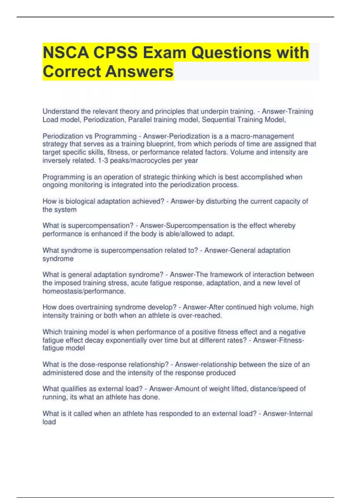 NSCA CPSS Exam Questions with Correct Answers Understand the relevant theory and principles that underpin training. - Answer-Training Load model, Periodization, Parallel training model, Sequential Training Model, Periodization vs Programming - Answer-Periodization is a a macro-management strategy that serves as a training blueprint, from which periods of time are assigned that target specific skills, fitness, or performance related factors. Volume and intensity are inversely related. 1-3 peaks/macrocycles per year Programming is an operation of strategic thinking which is best accomplished when ongoing monitoring is integrated into the periodization process. How is biological adaptation achieved? - Answer-by disturbing the current capacity of the system What is supercompensation? - Answer-Supercompensation is the effect whereby performance is enhanced if the body is able/allowed to adapt. What syndrome is supercompensation related to? - Answer-General adaptation syndrome What is general adaptation syndrome? - Answer-The framework of interaction between the imposed training stress, acute fatigue response, adaptation, and a new level of homeostasis/performance. How does overtraining syndrome develop? - Answer-After continued high volume, high intensity training or both when an athlete is over-reached. Which training model is when performance of a positive fitness effect and a negative fatigue effect decay exponentially over time but at different rates? - Answer-Fitness-fatigue model What is the dose-response relationship? - Answer-relationship between the size of an administered dose and the intensity of the response produced What qualifies as external load? - Answer-Amount of weight lifted, distance/speed of running, its what an athlete has done.