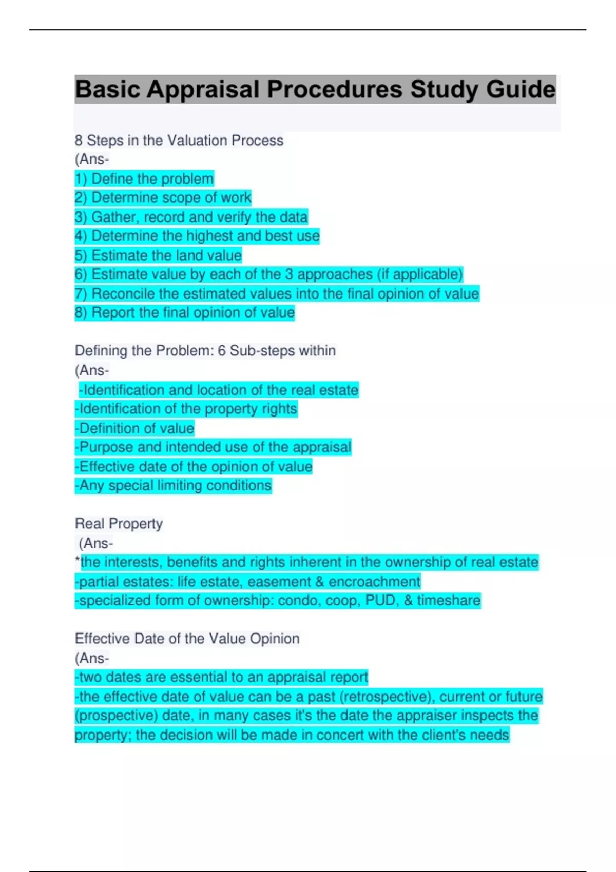 8 Steps in the Valuation Process (Ans- 1) Define the problem 2) Determine scope of work 3) Gather, record and verify the data 4) Determine the highest and best use 5) Estimate the land value 6) Estimate value by each of the 3 approaches (if applicable) 7) Reconcile the estimated values into the final opinion of value 8) Report the final opinion of value Defining the Problem: 6 Sub-steps within (Ans- -Identification and location of the real estate -Identification of the property rights -Definition of value -Purpose and intended use of the appraisal -Effective date of the opinion of value -Any special limiting conditions Real Property (Ans- *the interests, benefits and rights inherent in the ownership of real estate -partial estates: life estate, easement & encroachment -specialized form of ownership: condo, coop, PUD, & timeshare Effective Date of the Value Opinion (Ans- -two dates are essential to an appraisal report -the effective date of value can be a past (retrospective), current or future (prospective) date, in many cases it's the date the appraiser inspects the property; the decision will be made in concert with the client's needs -the date of the report is the date you sign and issue the final report Any Special Limiting Conditions (Ans- -two common types are: extraordinary assumption & hypothetical condition Extraordinary Assumption (Ans- *an assumption, directly related to a specific assignment, as of the effective date of the assignment results, which if found to be false, could alter the appraiser's opinions or conclusions -it presumes as fact otherwise uncertain information about physical, legal or economic characteristics of the subject property; or about conditions external to the property such as market conditions or trends; or about the integrity of data used in an analysis Hypothetical Condition (Ans- *a condition, directly related to a specific assignment, which is contrary to what is known by the appraiser to exist on the effective date of the assignment results, but is used for the purpose of analysis -it is contrary to known facts about physical, legal or economic characteristics of the subject property; or about conditions external to the property, such as market conditions or trends; or about the integrity of data used in an analysis -this type of appraisal could be significantly misleading to intended users if the use of the hypothetical condition were not properly disclosed Scope of Work (Ans- *the type and extent of research and analyses in an assignment -understanding which analyses, methods and techniques are necessary and what data are necessary to correctly complete the analyses is an integral part of the scope-of-work decision -the Scope of Work Rule was added to the 2006 edition of USPAP -applies to appraisal reviews assignments as well as appraisals -scope of work includes: -the extent to which the property is identified -the extent to which tangible property is inspected -the type and extent of data researched -the type and extent of analyses applied to arrive at opinions or conclusions