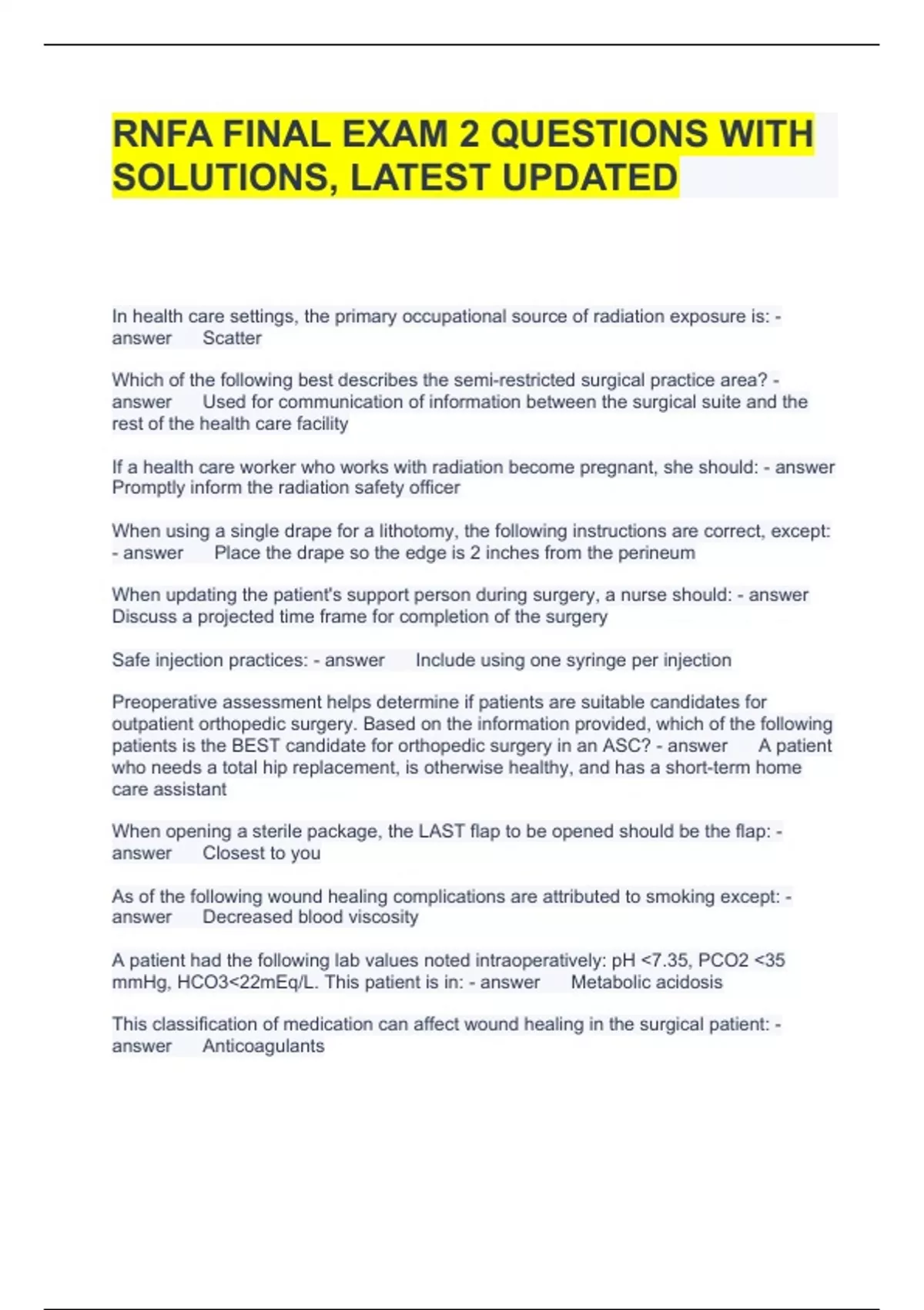 RNFA FINAL EXAM 2 QUESTIONS WITH SOLUTIONS, LATEST UPDATED In health care settings, the primary occupational source of radiation exposure is: Scatter Which of the following best describes the semi-restricted surgical practice area? Used for communication of information between the surgical suite and the rest of the health care facility Brainpower Read More Previous Play Next Rewind 10 seconds Move forward 10 seconds Unmute 0:10 / 0:15 Full screen If a health care worker who works with radiation become pregnant, she should: Promptly inform the radiation safety officer When using a single drape for a lithotomy, the following instructions are correct, except: Place the drape so the edge is 2 inches from the perineum When updating the patient's support person during surgery, a nurse should: Discuss a projected time frame for completion of the surgery Safe injection practices: Include using one syringe per injection Preoperative assessment helps determine if patients are suitable candidates for outpatient orthopedic surgery. Based on the information provided, which of the following patients is the BEST candidate for orthopedic surgery in an ASC? A patient who needs a total hip replacement, is otherwise healthy, and has a short-term home care assistant When opening a sterile package, the LAST flap to be opened should be the flap: Closest to you As of the following wound healing complications are attributed to smoking except: Decreased blood viscosity A patient had the following lab values noted intraoperatively: pH <7.35, PCO2 <35 mmHg, HCO3<22mEq/L. This patient is in: Metabolic acidosis This classification of medication can affect wound healing in the surgical patient: Anticoagulants When choosing a suture needle for tissue such as peritoneum, dura, and subcutaneous tissue, the most appropriate choice is the _______ needle. Taper During a THA using the posterior lateral approach, the RNFA will dislocated the head of the femur using: Flexion, adduction, external rotation Which of the following muscles are critical for stabilization of the knee joint? Quadriceps femoris During the cementing of components during total joint replacement, a new CRNA who has never worked in orthopedics before begins to panic. A side effect that possibly occurred with this patient as a result of the cement is: Hypotension A medication often used in cardiac surgery to prevent spasms of vessels is: Papaverine Physicians may consider which of the following options when determining the best treatment option for breast cancer surgery. Size of tumor The most commonly used incision for Cesarean section is the: Pfannensteil This technique is primarily reserved for the patient having prophylactic mastectomy and immediate breast reconstruction. Nipple sparing The RNFA should be prepared to assist with the _______ procedure if a patient needs surgical intervention for the treatment of atrial fibrillation Maze Prepping for an abdominal hysterectomy that may include the cervix should be performed in what order? Dirty then clean Care must be taken when placing reactors as an RNFA assisting with inguinal hernia repair. Which of the following is a vessel that is located in the area of i in inguinal hernias? Inferior epigastric When intraoperative cholangiograms are performed, the cholangiogram catheter is placed in the: Cystic duct When preoperatively assessing a patient for cardiac surgery, the RNFA should consider all of the following except: RBC count Pre-op markings to determine nipple positioning for reduction mammoplasty will be drawn on the patient's chest _____________. While sitting upright The wound classification assigned by the CDC to breast surgery. Clean Identify the marginal boundaries of the breasts. Second to sixth rib and horizontally from the lateral edge of sternum to anterior axillary line Reduction mammoplasty is not indicated for which of the following? hyperthelia The RNFA with the vascular surgery service is preparing to discharge Mark Weston, a 51 yr old male who recently had endovascular surgery. He will be taking anticoagulation therapy for the next 12 weeks. What statement regarding anticoagulation therapy, that is relevant to Mark, is true? Do not use tools such as saws or hammers, which could lead to an accident. Pericardial tamponade includes which of the following signs or symptoms? Narrow pulse pressure Identify the venous structure that prevents blood back flow. Semilunar Intimal folds Velour grafts are impregnated with which of the following to ease handling without the need to preclot? Gelatin The blood is oxygenated in the lungs and returns to the left atrium through the pulmonary veins. Where does the blood flow after leaving the left atrium? Through the mitral valve into the left ventricle