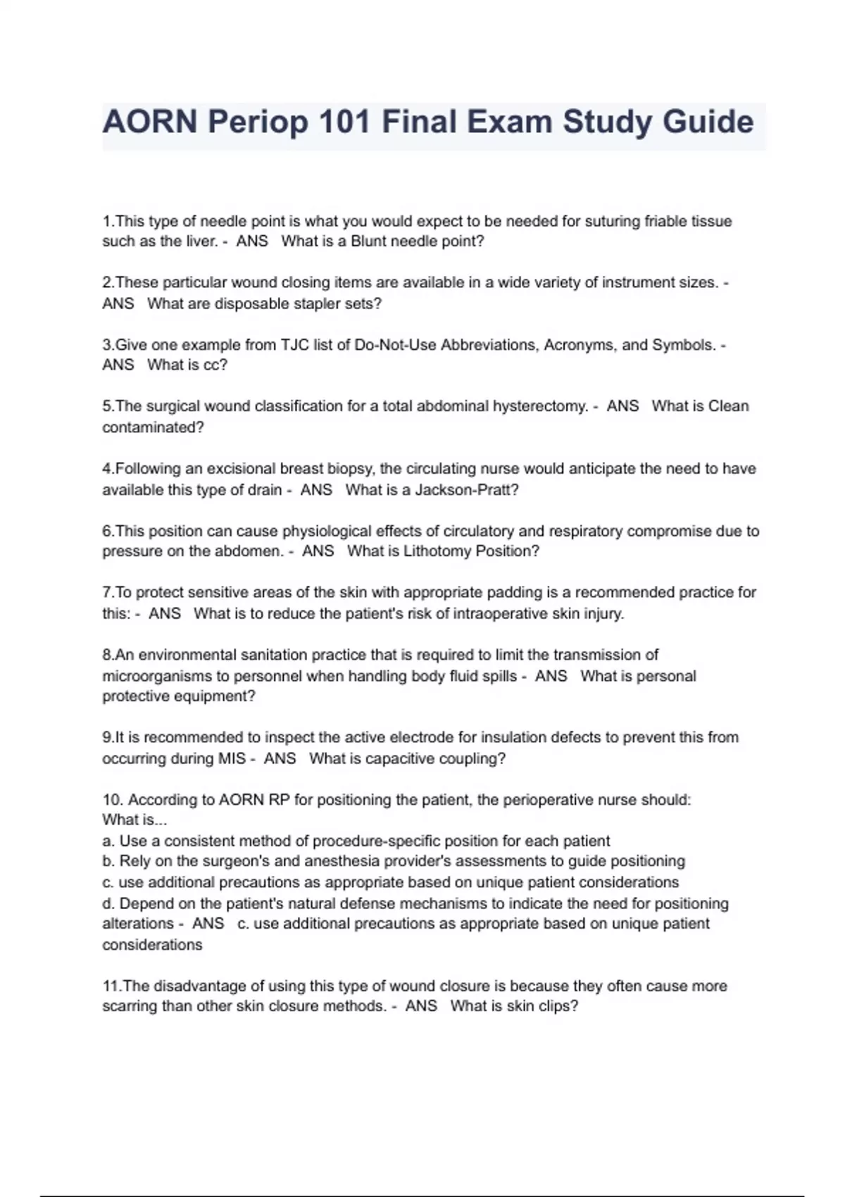 Exam (elaborations) AORN Periop 101 Questions And Answers 1.This type of needle point is what you would expect to be needed for suturing friable tissue such as the liver. - ANS What is a Blunt needle point? 2.These particular wound closing items are available in a wide variety of instrument sizes. - ANS What are disposable stapler sets? 3.Give one example from TJC list of Do-Not-Use Abbreviations, Acronyms, and Symbols. - ANS What is cc? 5.The surgical wound classification for a total abdominal hysterectomy. - ANS What is Clean contaminated? 4.Following an excisional breast biopsy, the circulating nurse would anticipate the need to have available this type of drain - ANS What is a Jackson-Pratt? 6.This position can cause physiological effects of circulatory and respiratory compromise due to pressure on the abdomen. - ANS What is Lithotomy Position? 7.To protect sensitive areas of the skin with appropriate padding is a recommended practice for this: - ANS What is to reduce the patient's risk of intraoperative skin injury. 8.An environmental sanitation practice that is required to limit the transmission of microorganisms to personnel when handling body fluid spills - ANS What is personal protective equipment? 9.It is recommended to inspect the active electrode for insulation defects to prevent this from occurring during MIS - ANS What is capacitive coupling? 10. According to AORN RP for positioning the patient, the perioperative nurse should: What is... a. Use a consistent method of procedure-specific position for each patient b. Rely on the surgeon's and anesthesia provider's assessments to guide positioning c. use additional precautions as appropriate based on unique patient considerations d. Depend on the patient's natural defense mechanisms to indicate the need for positioning alterations - ANS c. use additional precautions as appropriate based on unique patient considerations 11.The disadvantage of using this type of wound closure is because they often cause more scarring than other skin closure methods. - ANS What is skin clips? 12.An automatic intraoperative suspension of a do-not-resuscitate decision violates a patient's ethical right to... - ANS What is Self-determination? 13. This type of human factor error is responsible when a perioperative nurse is trying to attend to several tasks at once - ANS What is situational-based error? 14.Restricting pathogenic organisms from the patient, environment, equipment, and supplies is the definition of.... - ANS What is aseptic technique? The most important consideration when selecting these materials is to prevent risk of contaminating patients with endogenous and exogenous microorganisms; and risk of exposing healthcare workers to patient's blood and body fluids - ANS What are draping materials? 16.Patient and caregiver education for continuing post-op care at home is the primary focus of this Phase of post anesthesia care. - ANS What is Phase II? 17.According to the Institute of medicine recommendations for improving patient safety, this organization has the greatest potential impact to make changes on improving pt safety - ANS What are Healthcare organizations? 18. This statement about gloving technique is true What is... a. When gloving another person, always glove the left hand first. b. The scrub gown should be fastened in the back before donning gloves c. Open glove technique is used for initial donning of the sterile gown and gloves. d. Closed glove technique is used to glove the surgeon or assistant. - ANS b. The scrub gown should be fastened in the back before donning gloves 19. Draping material is this source in the fire triangle? (fuel, ignition, oxidizer) - ANS What is fuel source?