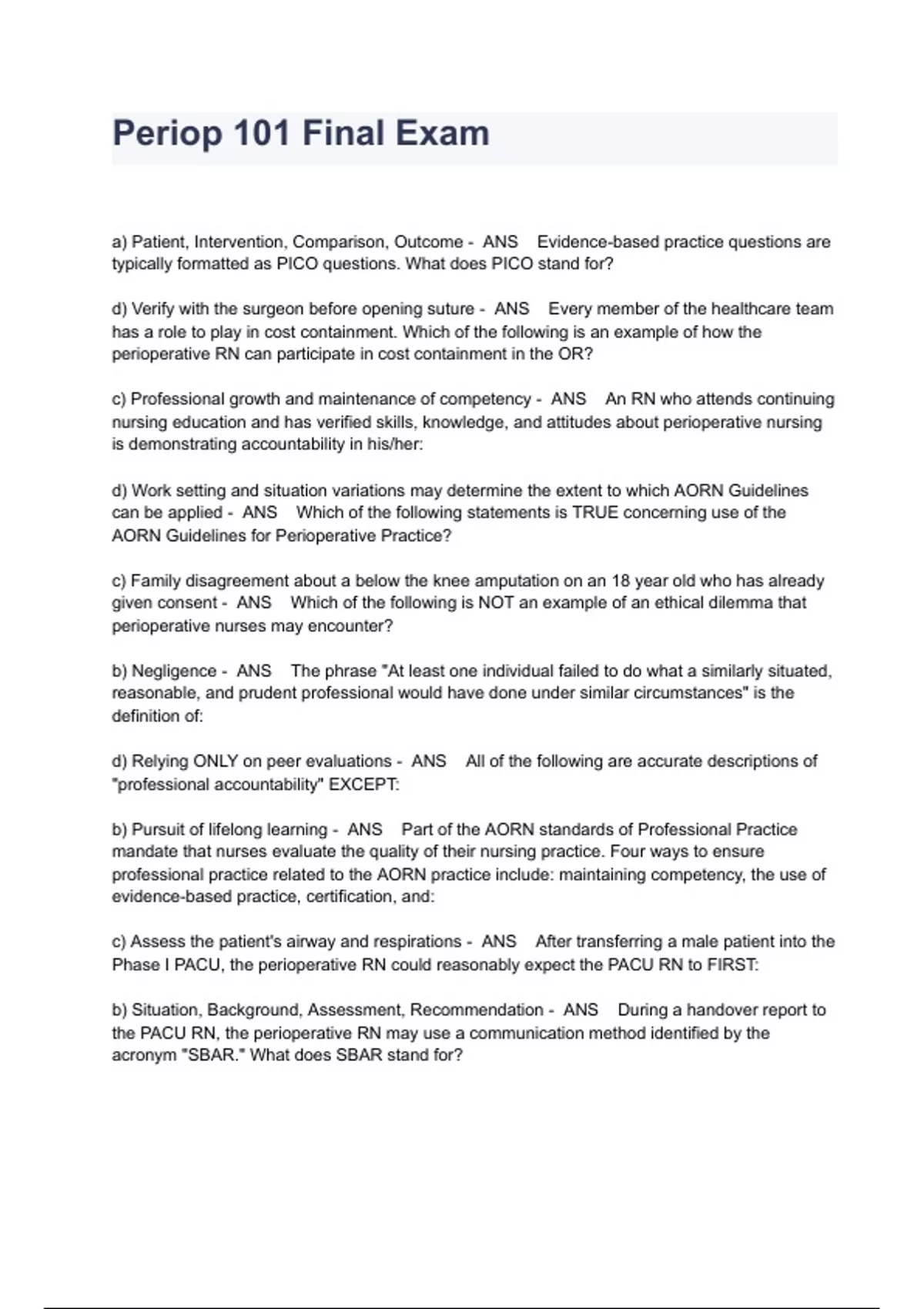 Periop 101 Final Exam Questions With Answers a) Patient, Intervention, Comparison, Outcome - ANS Evidence-based practice questions are typically formatted as PICO questions. What does PICO stand for? d) Verify with the surgeon before opening suture - ANS Every member of the healthcare team has a role to play in cost containment. Which of the following is an example of how the perioperative RN can participate in cost containment in the OR? c) Professional growth and maintenance of competency - ANS An RN who attends continuing nursing education and has verified skills, knowledge, and attitudes about perioperative nursing is demonstrating accountability in his/her: d) Work setting and situation variations may determine the extent to which AORN Guidelines can be applied - ANS Which of the following statements is TRUE concerning use of the AORN Guidelines for Perioperative Practice? c) Family disagreement about a below the knee amputation on an 18 year old who has already given consent - ANS Which of the following is NOT an example of an ethical dilemma that perioperative nurses may encounter? b) Negligence - ANS The phrase "At least one individual failed to do what a similarly situated, reasonable, and prudent professional would have done under similar circumstances" is the definition of: d) Relying ONLY on peer evaluations - ANS All of the following are accurate descriptions of "professional accountability" EXCEPT: b) Pursuit of lifelong learning - ANS Part of the AORN standards of Professional Practice mandate that nurses evaluate the quality of their nursing practice. Four ways to ensure professional practice related to the AORN practice include: maintaining competency, the use of evidence-based practice, certification, and: c) Assess the patient's airway and respirations - ANS After transferring a male patient into the Phase I PACU, the perioperative RN could reasonably expect the PACU RN to FIRST: b) Situation, Background, Assessment, Recommendation - ANS During a handover report to the PACU RN, the perioperative RN may use a communication method identified by the acronym "SBAR." What does SBAR stand for? c) Ask patient to describe his pain or use a standardized pain scale - ANS A 40-year-old male patient is awake and alert in the post anesthesia care unit after right shoulder surgery. What is the BEST measure to assess the patient's pain? d) The type of insulin the patient takes - ANS What would be the MOST important information for a nurse in Preadmission Testing (PAT) to collect on an insulin dependent diabetic patient? c) American Society of PeriAnesthesia Nursing - ANS The Perianesthesia nurse has ASPAN to guide their practice. What does ASPAN stand for? c) Situation, Background, Assessment, Recommendations - ANS You have completed your case and must now transport your patient to PACU. To give report to the PACU nurse, your facility requires that you provide report in SBAR, which stands for: c) Assessing patient airway and respirations - ANS You have just transferred your patient into the Phase I PACU. Which activities would you expect to observe FIRST? c) OR nurse - ANS A hand-over communication report is given by the anesthesia professional and the _________________? c) Cultural beliefs, perception of surgery, and religious beliefs - ANS What should be included as part of the psychological nursing assessment? a) Alert the surgeon and discuss the selection of preoperative skin antiseptic. - ANS During a preoperative interview, a patient reports that a surgical prep solution made him breakout in hives after a previous surgical procedure. What action should the perioperative RN take? a) Alcohol b) Herbal preparations c) Recreational Drugs d) Tobacco products e) All of the above - ANS During the preoperative interview, the perioperative RN should ask the patient's about their use of: a) Define the patient's risk factors and develop a plan of care - ANS The PRIMARY purpose of conducting a preoperative assessment is to: a) Decrease in vision including color and depth perception - ANS Which of the following sensory assessment findings is common among elderly patients? c) 3 to 6 years - ANS A child in which of the following age groups can be described as "likes to socialize and can interpret terms"? d) Lung capacity decreases with increasing age - ANS Which of the following statements is true? a) Decrease in subcutaneous fat - ANS Which of the following factors make geriatric patients more sensitive to injury and cold? b) Before the surgery - ANS A preoperative nursing assessment should be conducted by a perioperative RN at what point? d) Spiritual - ANS In relation to transcultural needs of the patient, it is important to include _______________ needs in the nursing assessment.