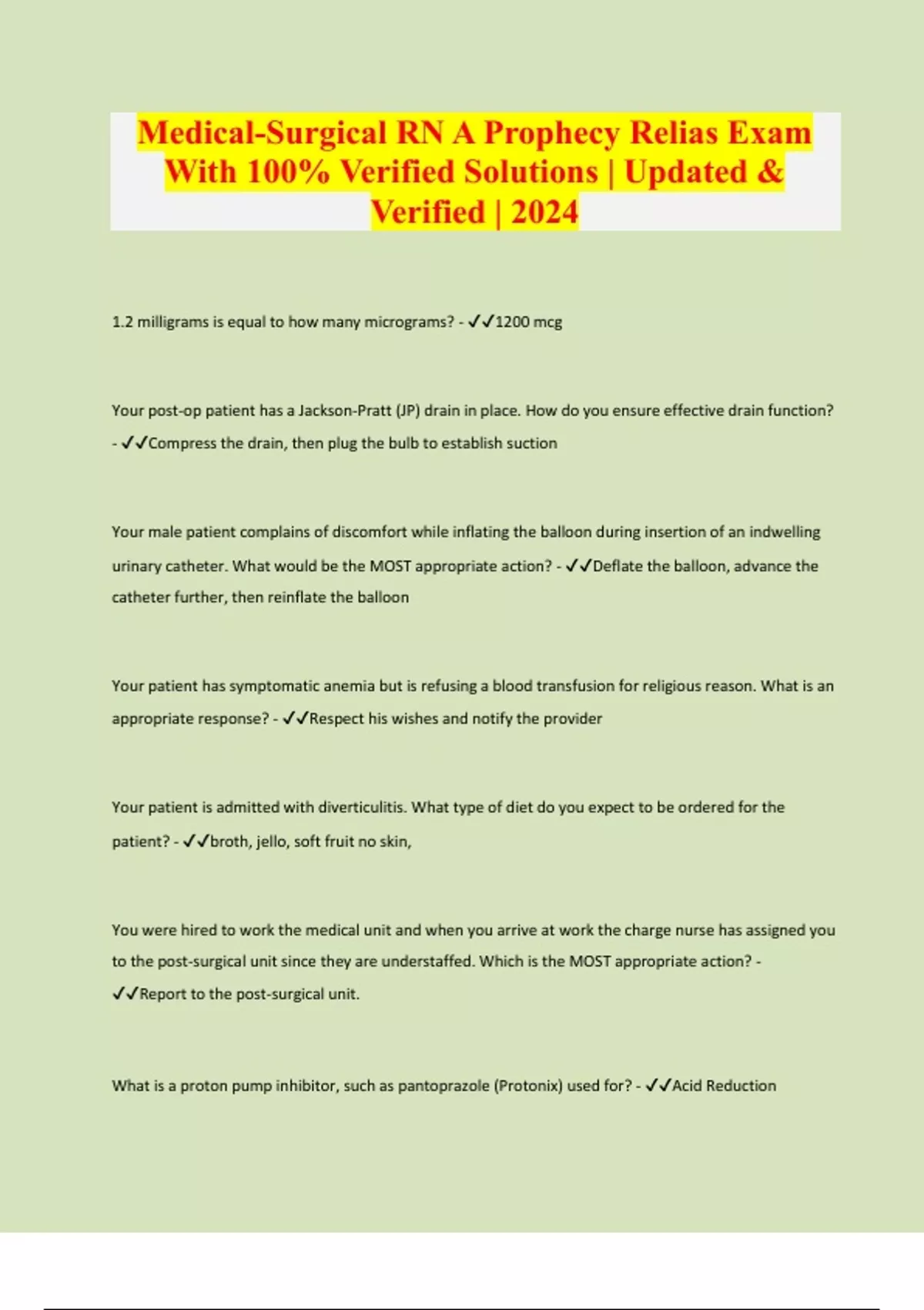 1.2 milligrams is equal to how many micrograms? - 1200 mcg Your post-op patient has a Jackson-Pratt (JP) drain in place. How do you ensure effective drain function? - Compress the drain, then plug the bulb to establish suction Your male patient complains of discomfort while inflating the balloon during insertion of an indwelling urinary catheter. What would be the MOST appropriate action? - Deflate the balloon, advance the catheter further, then reinflate the balloon Your patient has symptomatic anemia but is refusing a blood transfusion for religious reason. What is an appropriate response? - Respect his wishes and notify the provider Your patient is admitted with diverticulitis. What type of diet do you expect to be ordered for the patient? - broth, jello, soft fruit no skin