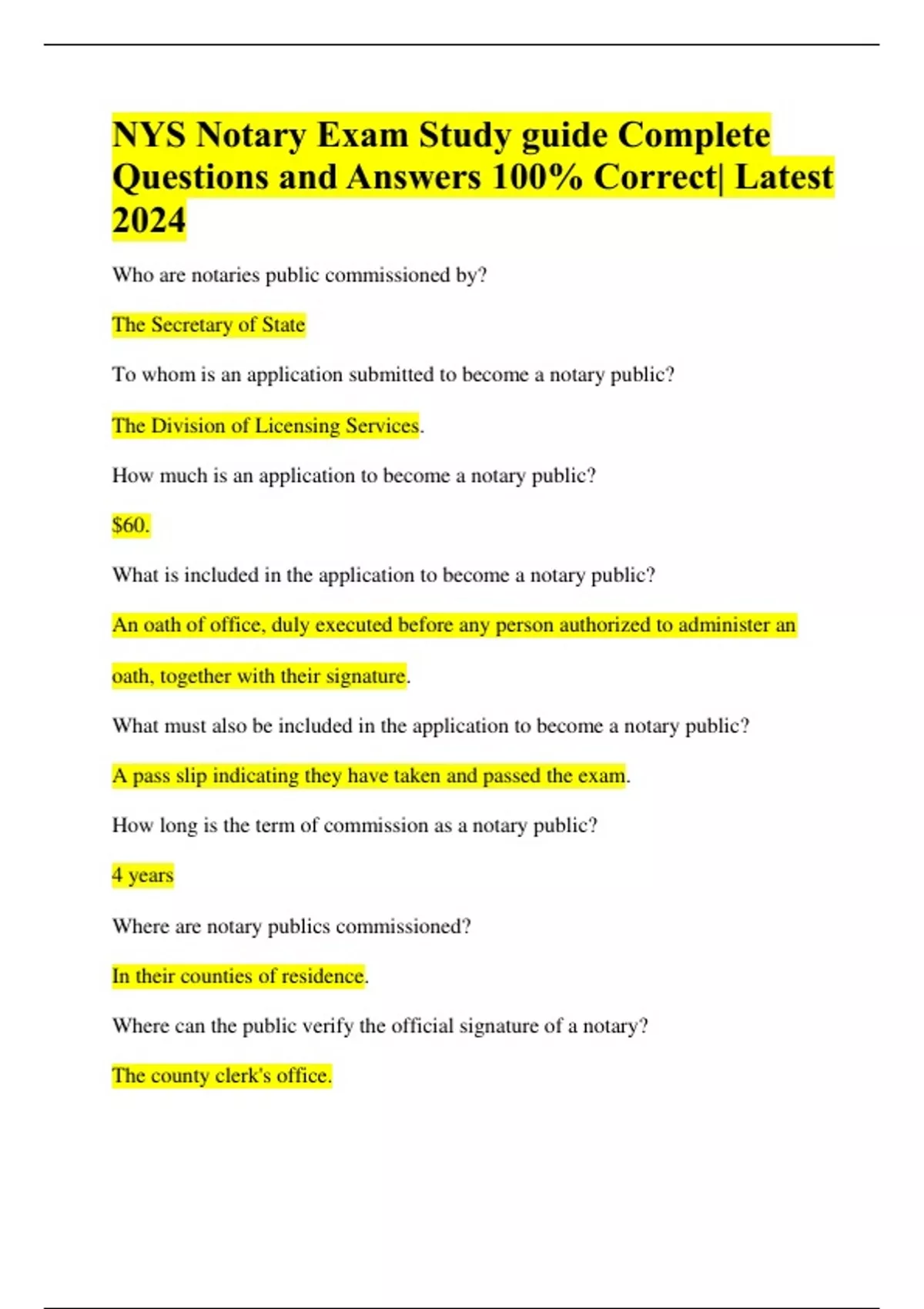 NYS Notary Exam Study guide Complete Questions and Answers 100% Correct| Latest 2024 Who are notaries public commissioned by? The Secretary of State To whom is an application submitted to become a notary public? The Division of Licensing Services. How much is an application to become a notary public? $60. What is included in the application to become a notary public? An oath of office, duly executed before any person authorized to administer an oath, together with their signature. What must also be included in the application to become a notary public? A pass slip indicating they have taken and passed the exam. How long is the term of commission as a notary public? 4 years Where are notary publics commissioned? In their counties of residence. Where can the public verify the official signature of a notary? The county clerk's office. When is authentication of a notary's signature obtained? When a document will be used outside the State. What should notaries do when they expect to sign documents regularly in counties other than their residence? File a certificate of official character with other New York state county clerks. Which nonresidents may be allowed to be a notary in a state?