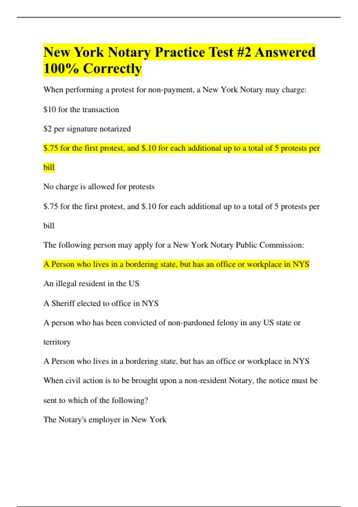 New York Notary Practice Test #2 Answered 100% Correctly New York Notary Practice Test #2 Answered 100% Correctly When performing a protest for non-payment, a New York Notary may charge: $10 for the transaction $2 per signature notarized $.75 for the first protest, and $.10 for each additional up to a total of 5 protests per bill No charge is allowed for protests $.75 for the first protest, and $.10 for each additional up to a total of 5 protests per bill The following person may apply for a New York Notary Public Commission: A Person who lives in a bordering state, but has an office or workplace in NYS An illegal resident in the US A Sheriff elected to office in NYS A person who has been convicted of non-pardoned felony in any US state or territory A Person who lives in a bordering state, but has an office or workplace in NYS When civil action is to be brought upon a non-resident Notary, the notice must be sent to which of the following?