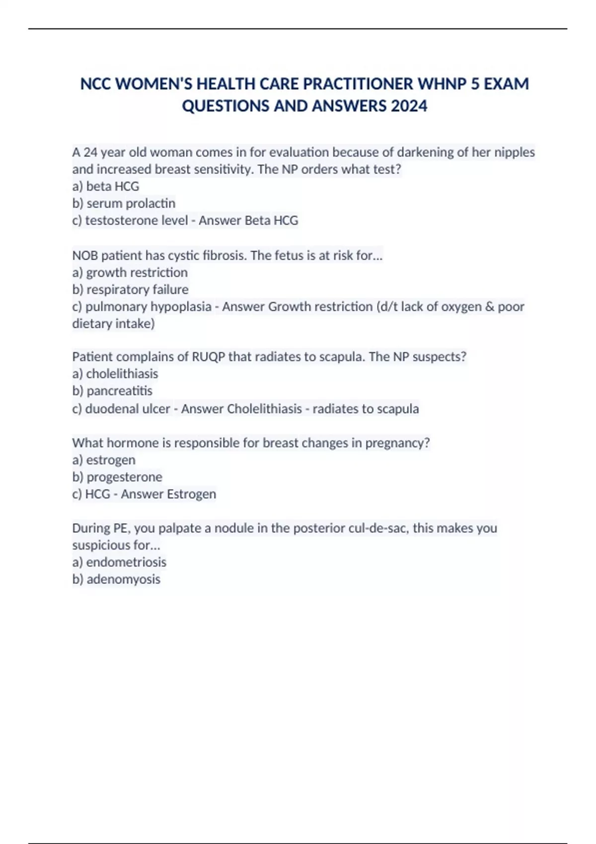 NCC WOMEN'S HEALTH CARE PRACTITIONER WHNP 5 EXAM QUESTIONS AND ANSWERS 2024 A 24 year old woman comes in for evaluation because of darkening of her nipples and increased breast sensitivity. The NP orders what test? a) beta HCG b) serum prolactin c) testosterone level - Answer Beta HCG