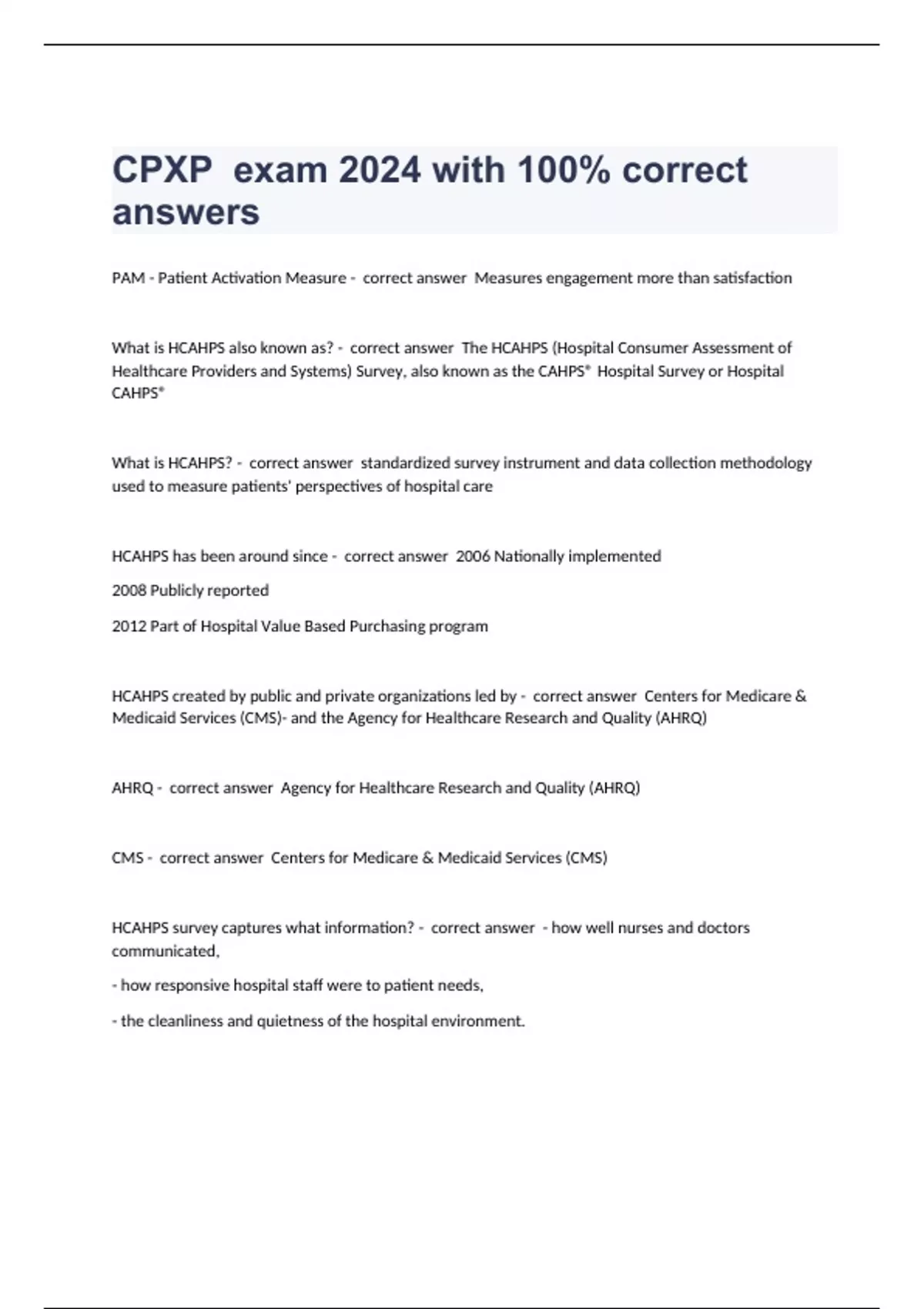 PAM - Patient Activation Measure - correct answer Measures engagement more than satisfaction What is HCAHPS also known as? - correct answer The HCAHPS (Hospital Consumer Assessment of Healthcare Providers and Systems) Survey, also known as the CAHPS® Hospital Survey or Hospital CAHPS® What is HCAHPS? - correct answer standardized survey instrument and data collection methodology used to measure patients' perspectives of hospital care HCAHPS has been around since - correct answer 2006 Nationally implemented 2008 Publicly reported 2012 Part of Hospital Value Based Purchasing program HCAHPS created by public and private organizations led by - correct answer Centers for Medicare & Medicaid Services (CMS)- and the Agency for Healthcare Research and Quality (AHRQ) AHRQ - correct answer Agency for Healthcare Research and Quality (AHRQ) CMS - correct answer Centers for Medicare & Medicaid Services (CMS) HCAHPS survey captures what information? - correct answer - how well nurses and doctors communicated, - how responsive hospital staff were to patient needs, - the cleanliness and quietness of the hospital environment.