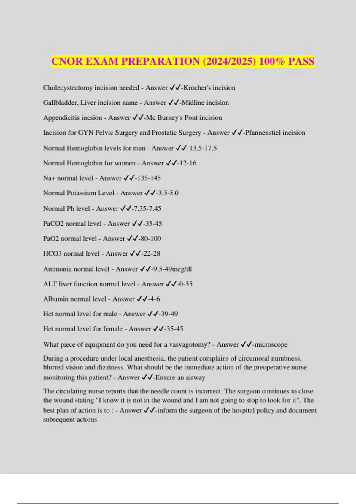 CNOR EXAM PREPARATION (2024/2025) 100% PASS Cholecystectomy incision needed - Answer ️️ -Krocher's incision Gallbladder, Liver incision name - Answer ️️ -Midline incision Appendicitis incsion - Answer ️️ -Mc Burney's Pont incision Incision for GYN Pelvic Surgery and Prostatic Surgery - Answer ️️ -Pfannenstiel incision Normal Hemoglobin levels for men - Answer ️️ -13.5-17.5 Normal Hemoglobin for women - Answer ️️ -12-16 Na+ normal level - Answer ️️ -135-145 Normal Potassium Level - Answer ️️ -3.5-5.0 Normal Ph level - Answer ️️ -7.35-7.45 PaCO2 normal level - Answer ️️ -35-45 PaO2 normal level - Answer ️️ -80-100 HCO3 normal level - Answer ️️ -22-28 Ammonia normal level - Answer ️️ -9.5-49mcg/dl ALT liver function normal level - Answer ️️ -0-35 Albumin normal level - Answer ️️ -4-6 Hct normal level for male - Answer ️️ -39-49 Hct normal level for female - Answer ️️ -35-45 What piece of equipment do you need for a vasvagotomy? - Answer ️️ -microscope During a procedure under local anesthesia, the patient complains of circumoral numbness, blurred vision and dizziness. What should be the immediate action of the preoperative nurse monitoring this patient? - Answer ️️ -Ensure an airway The circulating nurse reports that the needle count is incorrect. The surgeon continues to close the wound stating "I know it is not in the wound and I am not going to stop to look for it". The best plan of action is to : - Answer ️️ -inform the surgeon of the hospital policy and document subsequent actions A new employee unknowingly dispensed an unsterile solution to the sterile field. The following day the supervisor learns of the incident. The supervisors first action would be to: - Answer ️️ - Notify surgeon of the break in technique Where does decontamination begin? - Answer ️️ -Starts at the field, with wiping the instruments to keep the bioburden down How many air exchanges does Decontamination area have? - Answer ️️ -6 air exchanges