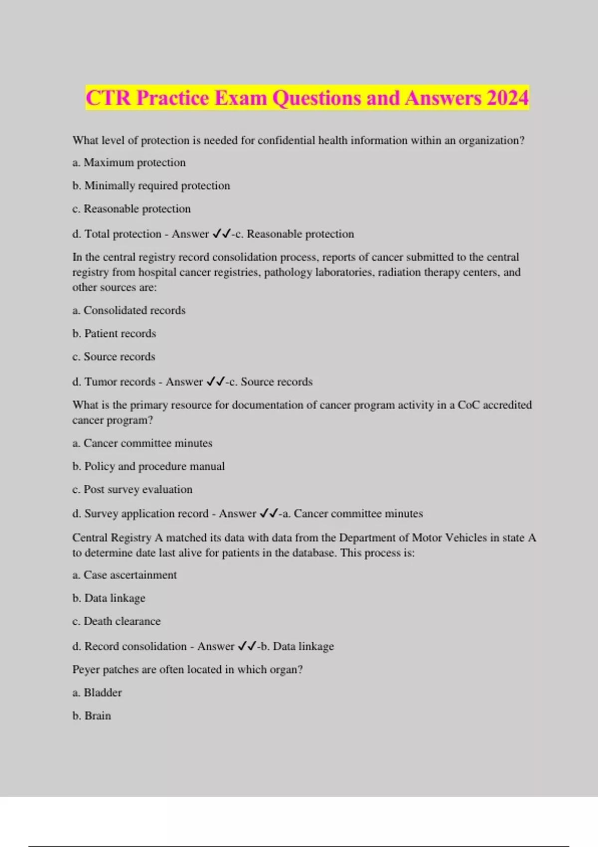 CTR Practice Exam Questions and Answers 2024 What level of protection is needed for confidential health information within an organization? a. Maximum protection b. Minimally required protection c. Reasonable protection d. Total protection - Answer ️️ -c. Reasonable protection In the central registry record consolidation process, reports of cancer submitted to the central registry from hospital cancer registries, pathology laboratories, radiation therapy centers, and other sources are: a. Consolidated records b. Patient records c. Source records d. Tumor records - Answer ️️ -c. Source records What is the primary resource for documentation of cancer program activity in a CoC accredited cancer program? a. Cancer committee minutes b. Policy and procedure manual c. Post survey evaluation d. Survey application record - Answer ️️ -a. Cancer committee minutes Central Registry A matched its data with data from the Department of Motor Vehicles in state A to determine date last alive for patients in the database. This process is: a. Case ascertainment b. Data linkage c. Death clearance d. Record consolidation - Answer ️️ -b. Data linkage Peyer patches are often located in which organ? a. Bladder b. Brain c. Kidney d. Small intestine - Answer ️️ -d. Small intestine What is the class of case for a patient who was diagnosed and received beam radiation for painful bone metastasis at the reporting facility? a. 00 b. 14 c. 22 d. 31 - Answer ️️ -b. 14 Tumor histology is rhabdomyosarcoma. Primary site is most likely: a. Blood vessel b. Bone c. Skeletal muscle d. Uterus - Answer ️️ -c. Skeletal muscle What is a pathological staging system based on resection of the tumor and measures the depth of invasion through the mucosa and bowel wall? a. Ann Arbor b. Breslow's depth of invasion c. Duke's d. Whitmore - Answer ️️ -c. Duke's To be compliant with Standard 4.8 Quality Improvements, who needs to be notified of the patient care improvements each year? a. Pharmacy b. Quality Improvement Department c. Risk Management d. Medical Staff and Administration - Answer ️️ -d. Medical Staff and Administration The following data set is ages of patients diagnosed with osteosarcoma: [5, 7, 10, 12, 12, 14, and 17]. What is the mean of the data