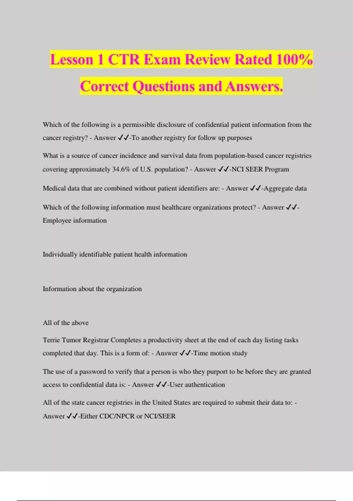 Lesson 1 CTR Exam Review Rated 100% Correct Questions and Answers. Which of the following is a permissible disclosure of confidential patient information from the cancer registry? - Answer ️️ -To another registry for follow up purposes What is a source of cancer incidence and survival data from population-based cancer registries covering approximately 34.6% of U.S. population? - Answer ️️ -NCI SEER Program Medical data that are combined without patient identifiers are: - Answer ️️ -Aggregate data Which of the following information must healthcare organizations protect? - Answer ️️ - Employee information Individually identifiable patient health information Information about the organization All of the above Terrie Tumor Registrar Completes a productivity sheet at the end of each day listing tasks completed that day. This is a form of: - Answer ️️ -Time motion study The use of a password to verify that a person is who they purport to be before they are granted access to confidential data is: - Answer ️️ -User authentication All of the state cancer registries in the United States are required to submit their data to: - Answer ️️ -Either CDC/NPCR or NCI/SEER Caitlin Cancer Registrar is the cancer registry manager. She received a budget for the registry from the office of the facility's chief financial officer. This type of budget is: - Answer ️️ -Top- down Danielle Data Manager is preparing to submit data from the hospital cancer registry to the state central registry. What is used to facilitate the data exchange? - Answer ️️ -NAACCR data exchange record layout The ability for a cancer registry to incorporate electronic data from an external source into the registry and the ability for external recipients to incorporate registry data for their use is: - Answer ️️ -Interoperability What type of cancer registry is designed to determine cancer patterns among various populations, monitor cancer trends over time, and evaluate cancer control efforts? - Answer ️️ -population- base