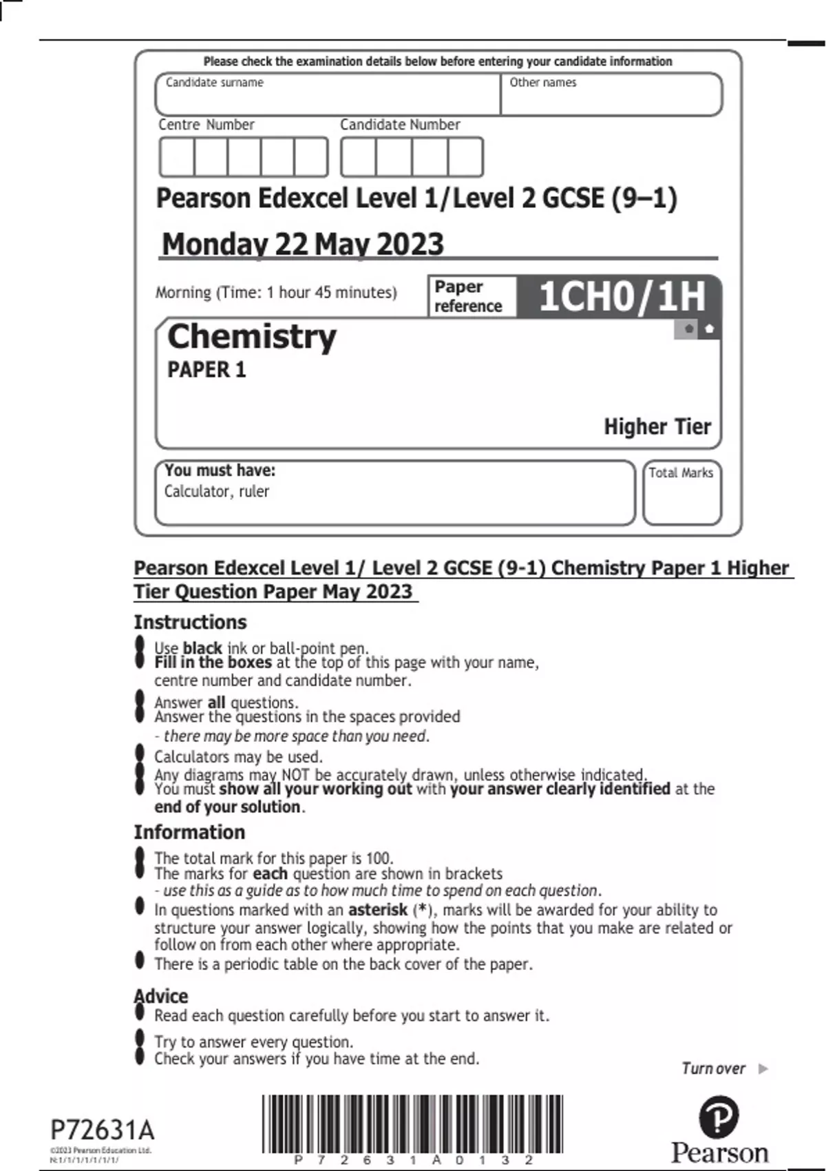 Pearson Edexcel Level 1/ Level 2 GCSE (9-1) Chemistry Paper 1 Higher
