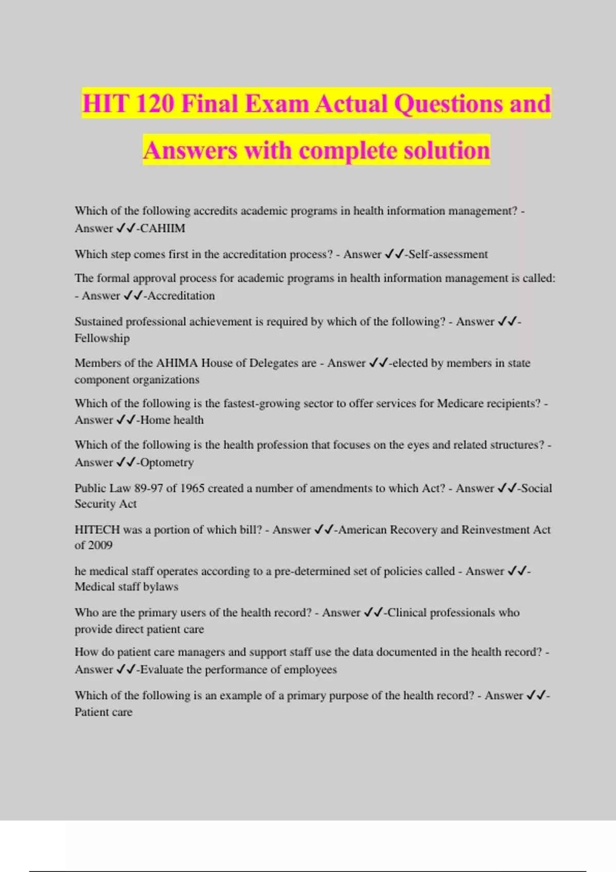 HIT 120 Final Exam Actual Questions and Answers with complete solution Which of the following accredits academic programs in health information management? - Answer ️️ -CAHIIM Which step comes first in the accreditation process? - Answer ️️ -Self-assessment The formal approval process for academic programs in health information management is called: - Answer ️️ -Accreditation Sustained professional achievement is required by which of the following? - Answer ️️ - Fellowship Members of the AHIMA House of Delegates are - Answer ️️ -elected by members in state component organizations Which of the following is the fastest-growing sector to offer services for Medicare recipients? - Answer ️️ -Home health Which of the following is the health profession that focuses on the eyes and related structures? - Answer ️️ -Optometry Public Law 89-97 of 1965 created a number of amendments to which Act? - Answer ️️ -Social Security Act HITECH was a portion of which bill? - Answer ️️ -American Recovery and Reinvestment Act of 2009 he medical staff operates according to a pre-determined set of policies called - Answer ️️ - Medical staff bylaws Who are the primary users of the health record? - Answer ️️ -Clinical professionals who provide direct patient care How do patient care managers and support staff use the data documented in the health record? - Answer ️️ -Evaluate the performance of employees Which of the following is an example of a primary purpose of the health record? - Answer ️️ - Patient care
