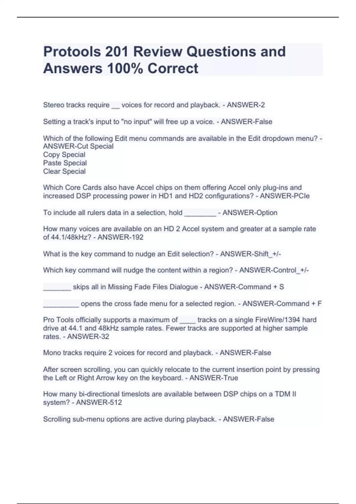 Protools 201 Review Questions and Answers 100% CorrectProtools 201 Review Questions and Answers 100% CorrectProtools 201 Review Questions and Answers 100% CorrectProtools 201 Review Questions and Answers 100% CorrectStereo tracks require __ voices for record and playback. - ANSWER-2 Setting a track's input to "no input" will free up a voice. - ANSWER-False Which of the following Edit menu commands are available in the Edit dropdown menu? - ANSWER-Cut Special Copy Special Paste Special Clear Special Which Core Cards also have Accel chips on them offering Accel only plug-ins and increased DSP processing power in HD1 and HD2 configurations? - ANSWER-PCIe