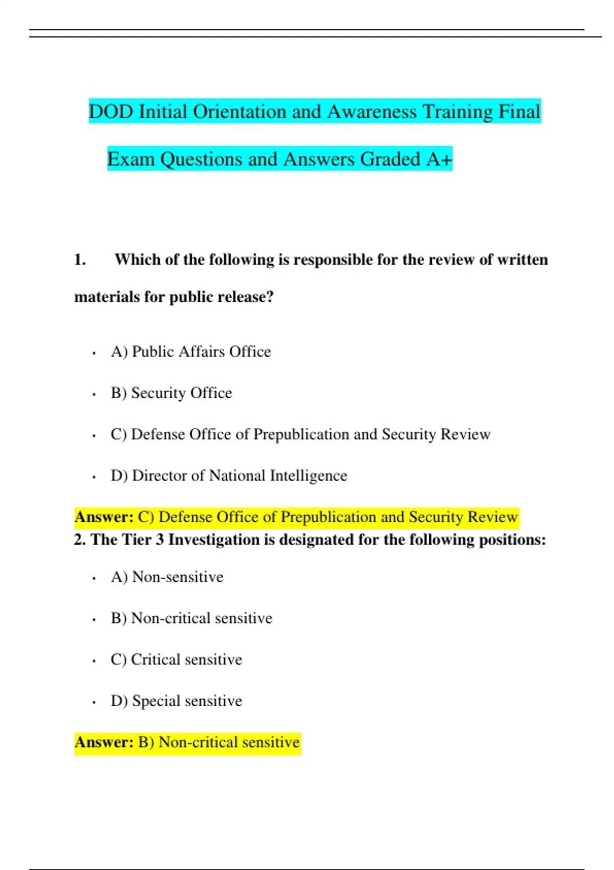 1. Which of the following is responsible for the review of written materials for public release? • A) Public Affairs Office • B) Security Office • C) Defense Office of Prepublication and Security Review • D) Director of National Intelligence Answer: C) Defense Office of Prepublication and Security Review 2. The Tier 3 Investigation is designated for the following positions: • A) Non-sensitive • B) Non-critical sensitive • C) Critical sensitive • D) Special sensitive Answer: B) Non-critical sensitive 3. Which of the following methods may be used to transmit Top Secret material? • A) Appropriately cleared courier • B) U.S. Postal Service Registered Mail • C) Commercial delivery • D) Protected facsimile, message, or voice Answer: A) Appropriately cleared courier; D) Protected facsimile, message, or voice. 4. All of the following are examples of Adverse Information that must be reported EXCEPT:
