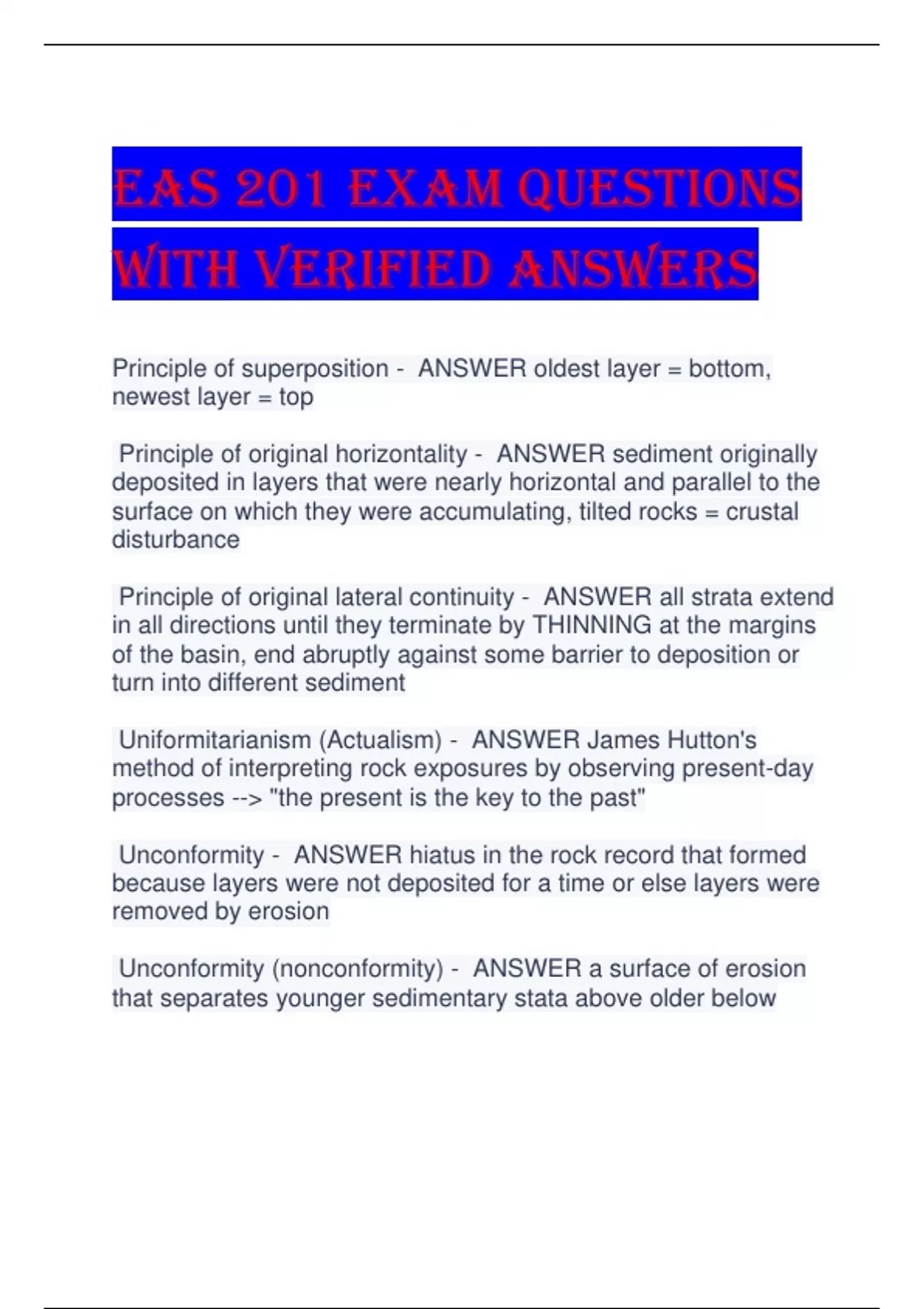 EAS 201 Exam Questions With Verified Answers Principle of superposition - ANSWER oldest layer = bottom, newest layer = top Principle of original horizontality - ANSWER sediment originally deposited in layers that were nearly horizontal and parallel to the surface on which they were accumulating, tilted rocks = crustal disturbance Principle of original lateral continuity - ANSWER all strata extend in all directions until they terminate by THINNING at the margins of the basin, end abruptly against some barrier to deposition or turn into different sediment Uniformitarianism (Actualism) - ANSWER James Hutton's method of interpreting rock exposures by observing present-day processes -- "the present is the key to the past" Unconformity - ANSWER hiatus in the rock record that formed because layers were not deposited for a time or else layers were removed by erosion Unconformity (nonconformity) - ANSWER a surface of erosion that separates younger sedimentary stata above older below Unconformity (disconformity) - ANSWER a surface or erosion in which the orientation of older strata, below, are parallel to younger strata above Unconformity (Angular) - ANSWER a surface of erosion between two groups of sedimentary rocks in which the orientation of the older strata, below, are at an angle to the younger strata above Principle of cross-cutting relationships (inclusions) - ANSWER fragments within larger rock masses are older than the rock masses in which they are enclosed despite colour, lighter rock can be older than darker Concept of inclusion - ANSWER the stuff within the 'matrix' must be older Formation (principle of biologic succession) - ANSWER William Smith - certain rock units that could be identified by the particular assemblages of fossils they contained Biostratigraphy - ANSWER William Smith - the life forms of each age in history were unique for particular periods, allows geologists to correlate contemporaneous formations around the world Half life - ANSWER The time required for one half of the atoms of a radioisotope to emit radiation an decay products Daughter element - ANSWER The chemical product in a radioactive decay equation produced from decayed parent elements. Mineral - ANSWER a naturally occurring, inorganic, solid element or compound with a definite chemical composition and a regular internal crystal structure Mineral formation - ANSWER -crystallization from magma -crystal growth in the solid state -precipitation from solution Cation - ANSWER positive charged ion Anion - ANSWER negative charged ion Ionic compound - ANSWER cations and anions, NaCl Covalent - ANSWER
