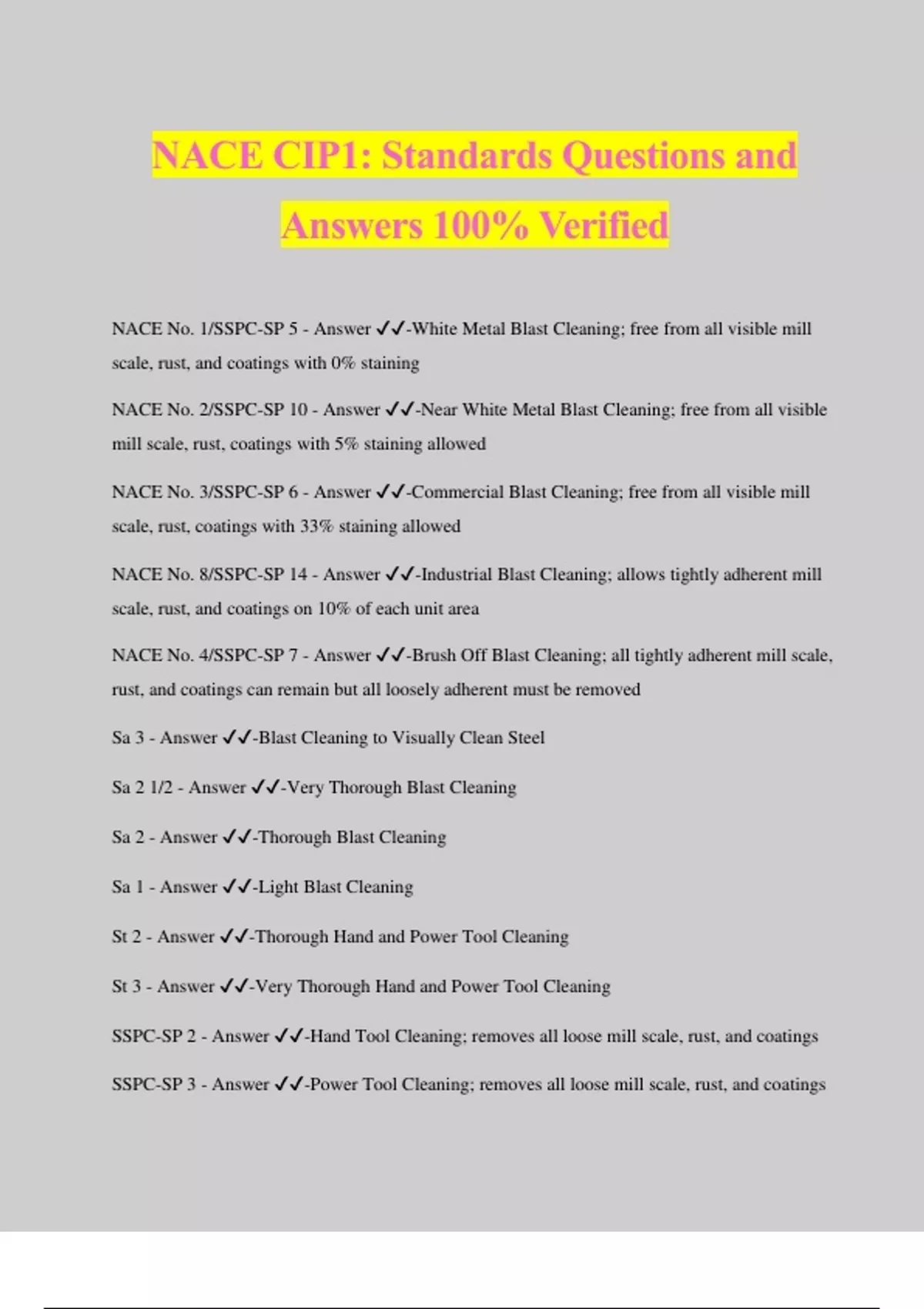 NACE CIP1: Standards Questions and Answers 100% Verified NACE No. 1/SSPC-SP 5 - Answer ️️ -White Metal Blast Cleaning; free from all visible mill scale, rust, and coatings with 0% staining NACE No. 2/SSPC-SP 10 - Answer ️️ -Near White Metal Blast Cleaning; free from all visible mill scale, rust, coatings with 5% staining allowed NACE No. 3/SSPC-SP 6 - Answer ️️ -Commercial Blast Cleaning; free from all visible mill scale, rust, coatings with 33% staining allowed NACE No. 8/SSPC-SP 14 - Answer ️️ -Industrial Blast Cleaning; allows tightly adherent mill scale, rust, and coatings on 10% of each unit area NACE No. 4/SSPC-SP 7 - Answer ️️ -Brush Off Blast Cleaning; all tightly adherent mill scale, rust, and coatings can remain but all loosely adherent must be removed Sa 3 - Answer ️️ -Blast Cleaning to Visually Clean Steel Sa 2 1/2 - Answer ️️ -Very Thorough Blast Cleaning Sa 2 - Answer ️️ -Thorough Blast Cleaning Sa 1 - Answer ️️ -Light Blast Cleaning St 2 - Answer ️️ -Thorough Hand and Power Tool Cleaning St 3 - Answer ️️ -Very Thorough Hand and Power Tool Cleaning SSPC-SP 2 - Answer ️️ -Hand Tool Cleaning; removes all loose mill scale, rust, and coatings SSPC-SP 3 - Answer ️️ -Power Tool Cleaning; removes all loose mill scale, rust, and coatings