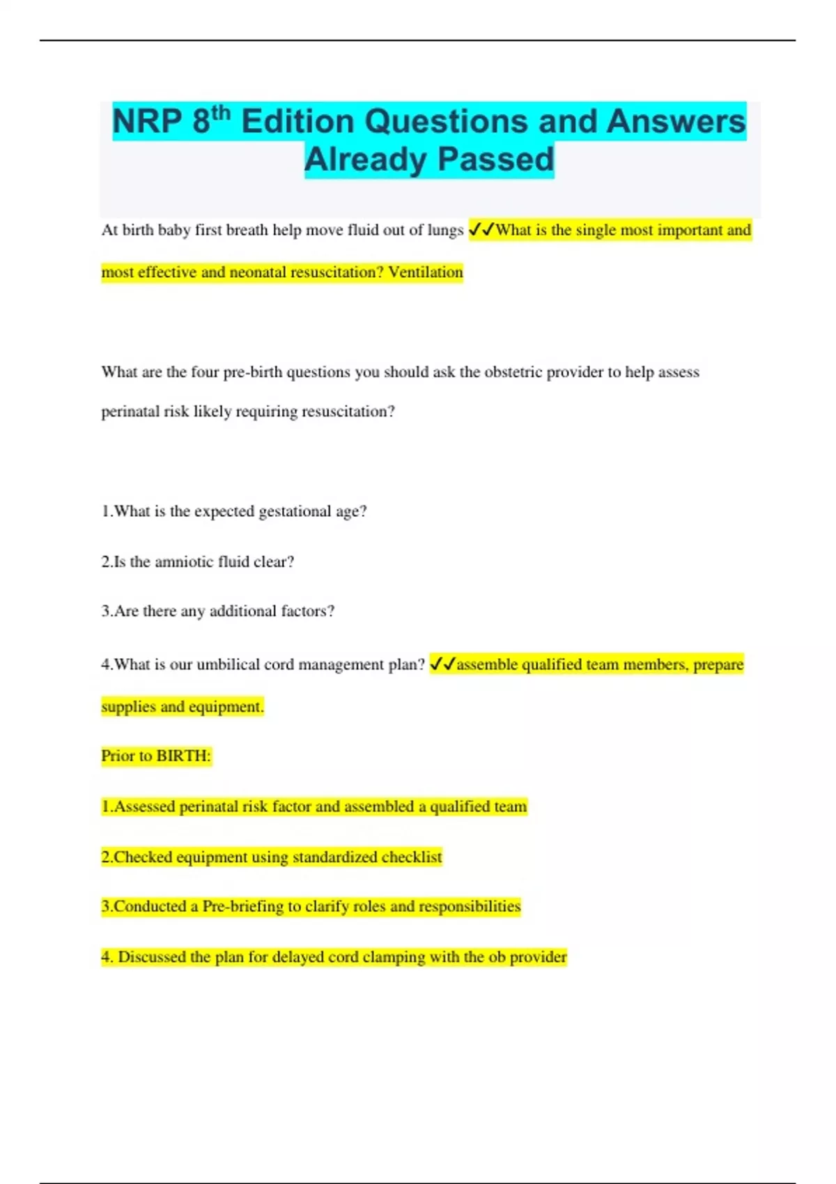 NRP 8th Edition Questions and Answers Already Passed