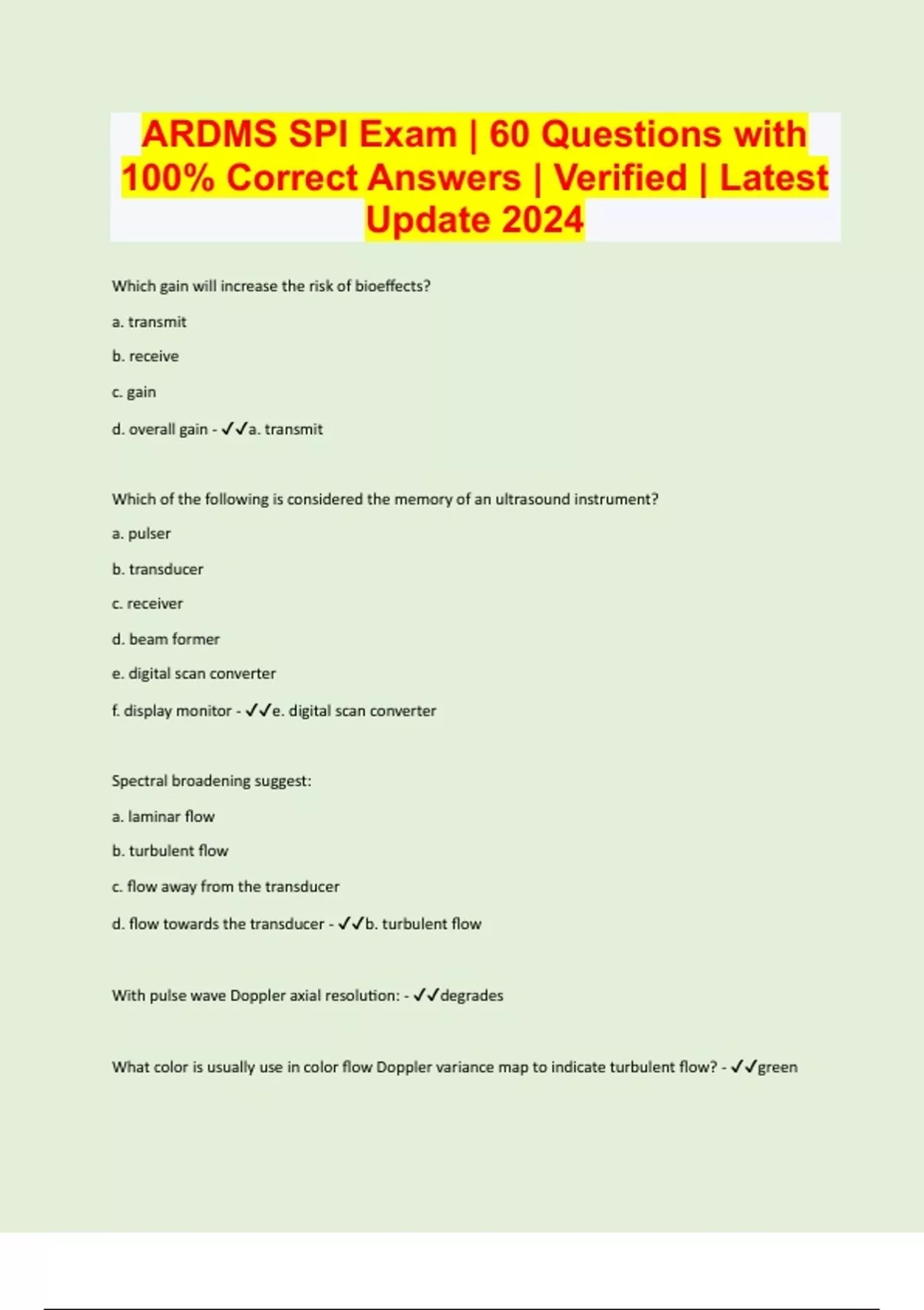 Which gain will increase the risk of bioeffects? a. transmit b. receive c. gain d. overall gain - a. transmit Which of the following is considered the memory of an ultrasound instrument? a. pulser b. transducer c. receiver d. beam former e. digital scan converter f. display monitor - e. digital scan converter Spectral broadening suggest: a. laminar flow b. turbulent flow c. flow away from the transducer d. flow towards the transducer - b. turbulent flow