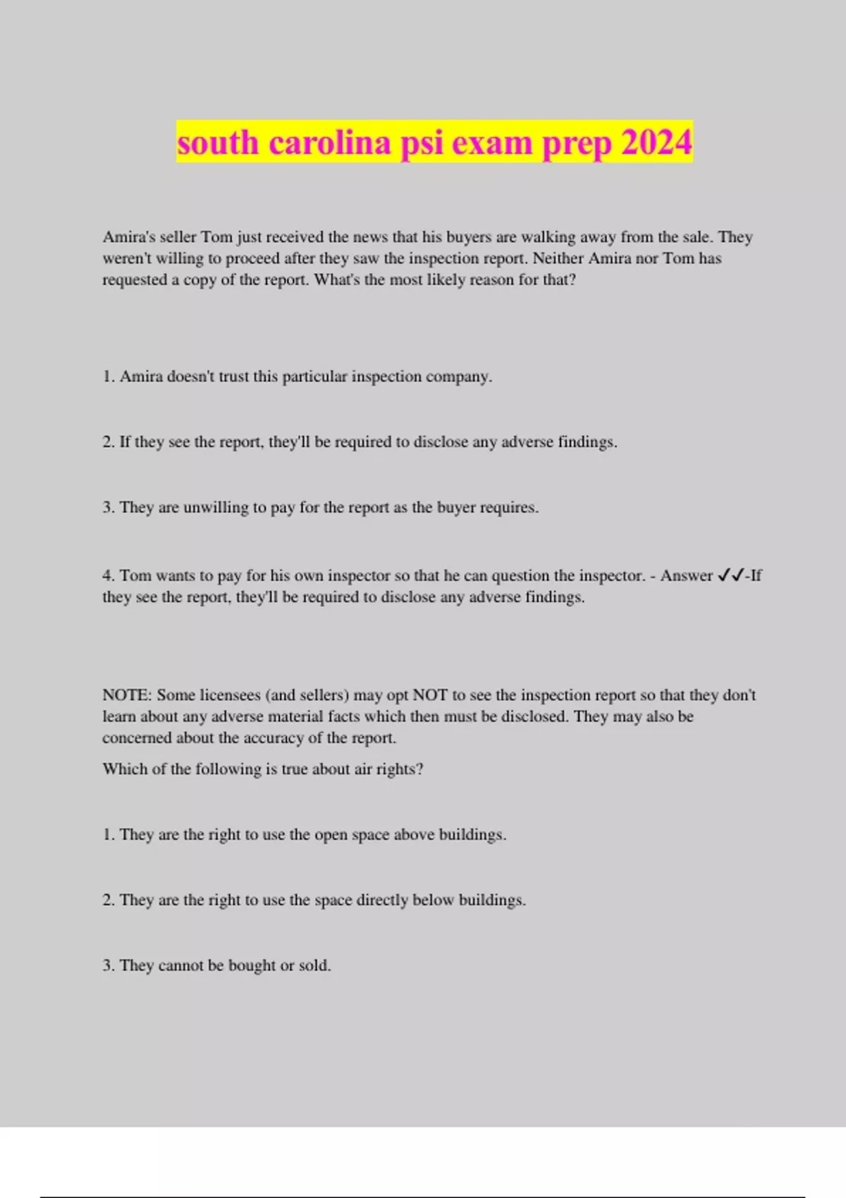 south carolina psi exam prep 2024 Amira's seller Tom just received the news that his buyers are walking away from the sale. They weren't willing to proceed after they saw the inspection report. Neither Amira nor Tom has requested a copy of the report. What's the most likely reason for that? 1. Amira doesn't trust this particular inspection company. 2. If they see the report, they'll be required to disclose any adverse findings. 3. They are unwilling to pay for the report as the buyer requires. 4. Tom wants to pay for his own inspector so that he can question the inspector. - Answer ️️ -If they see the report, they'll be required to disclose any adverse findings. NOTE: Some licensees (and sellers) may opt NOT to see the inspection report so that they don't learn about any adverse material facts which then must be disclosed. They may also be concerned about the accuracy of the report. Which of the following is true about air rights? 1. They are the right to use the open space above buildings. 2. They are the right to use the space directly below buildings. 3. They cannot be bought or sold. 4. They include mineral rights. - Answer ️️ -They are the right to use the open space above buildings. NOTE: Air rights involve the right to use the open space above buildings up to a height established by law. Jacob's family has operated a neighborhood grocery store in the community since before the land was zoned residential. Jacob continues to operate the store legally. What would you call this? 1. Mixed use 2. Non-conforming use 3. Residential retail use 4. Special use - Answer ️️ -Non-conforming use NOTE: Legal, non-conforming use of land occurs when a structure or business was legally established according to zoning ordinances at the time, but does not meet current zoning and building regulations. This is called being "grandfathered." If there is some kind of defect on a property's title, what effect does this level of transferability have on the property's value? 1. The value remains unchanged. 2. The value will fall. 3. The value will rise. 4. Transferability has no effect on value. - Answer ️️ -The value will fall. If a property can't be easily transferred, this will have a negative effect on value, causing it to fall. A strip mall valued at $850,000 has a $67,500 annual net operating income. What is the capitalization rate for the