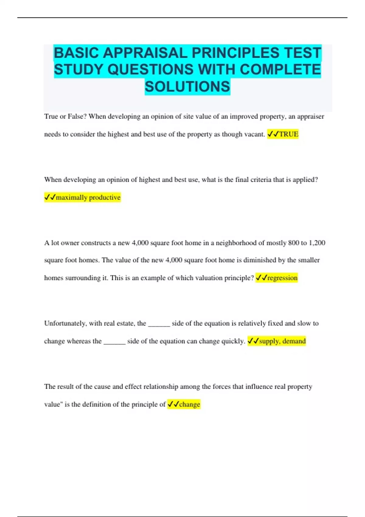 BASIC APPRAISAL PRINCIPLES TEST STUDY QUESTIONS WITH COMPLETE SOLUTIONS
