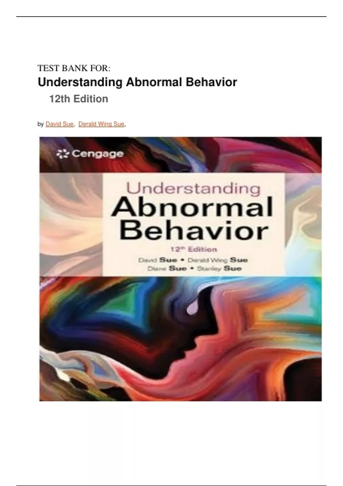 TEST BANK FOR: Understanding Abnormal Behavior 12th Edition by David Sue, Derald Wing Sue, Latest edition 2024