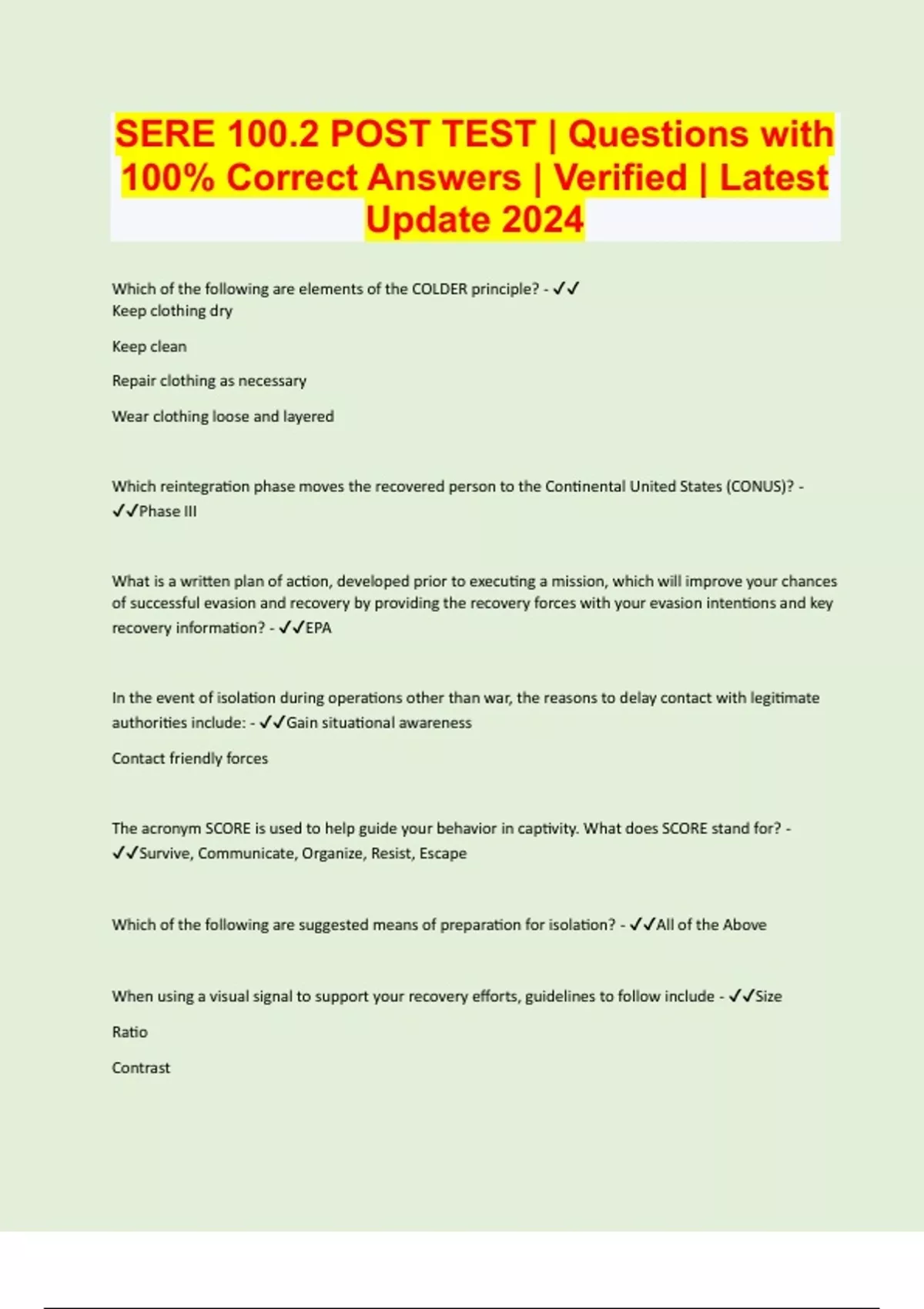SERE 100.2 POST TEST | Questions with 100% Correct Answers | Verified | Latest Update 2024