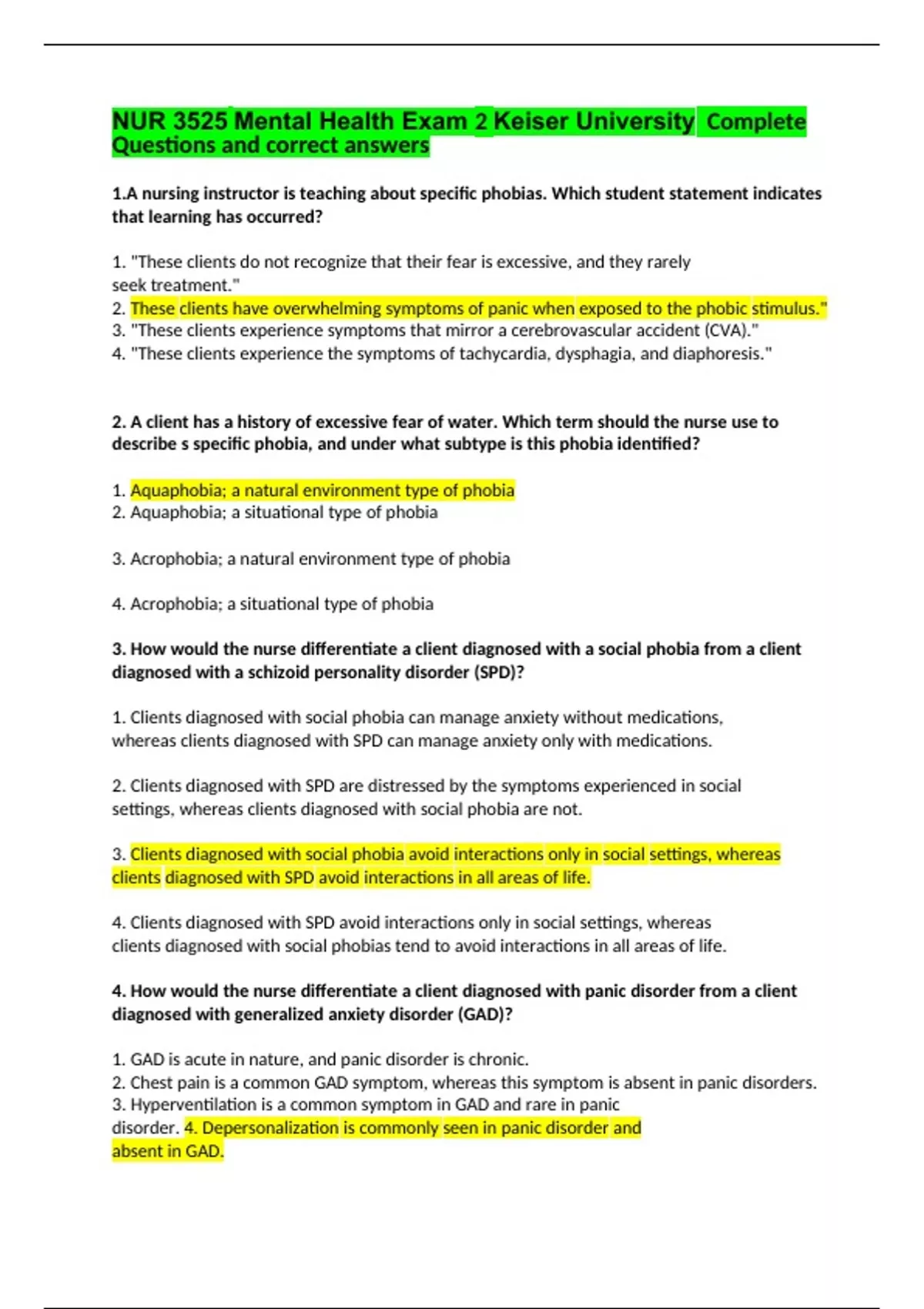 NUR 3525 Mental Health Exam 2 Keiser University Complete Questions and correct answers