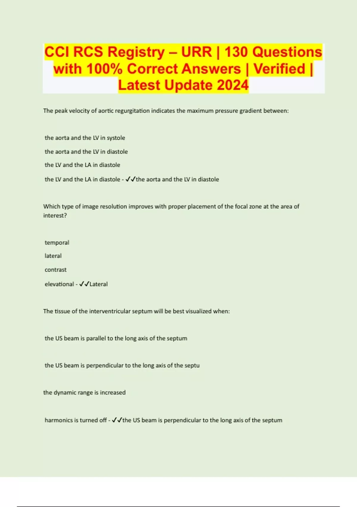 The peak velocity of aortic regurgitation indicates the maximum pressure gradient between: the aorta and the LV in systole the aorta and the LV in diastole the LV and the LA in diastole the LV and the LA in diastole - the aorta and the LV in diastole Which type of image resolution improves with proper placement of the focal zone at the area of interest? temporal lateral contrast elevational - Lateral The tissue of the interventricular septum will be best visualized when: