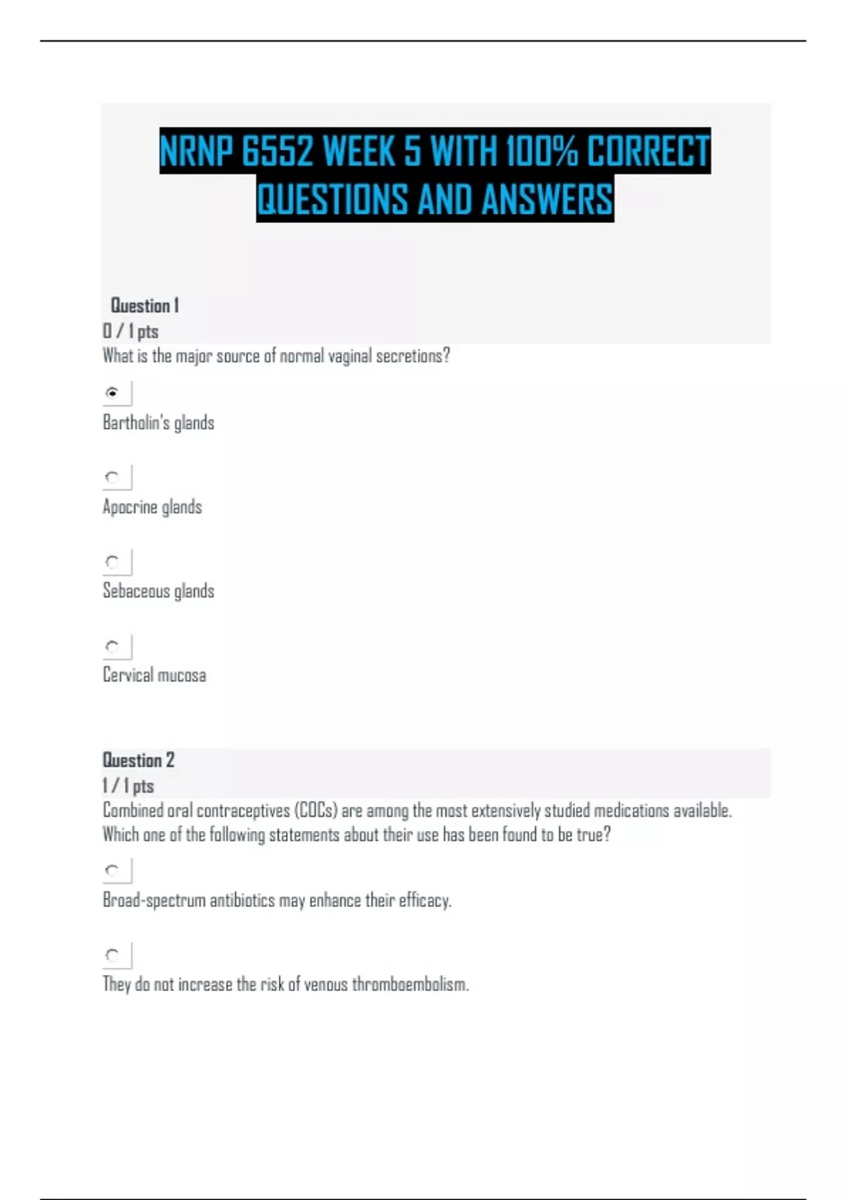 NRNP 6552 WEEK 5 WITH 100% CORRECT QUESTIONS AND ANSWERS Question 1 0 / 1 pts What is the major source of normal vaginal secretions? Bartholin’s glands Apocrine glands Sebaceous glands Cervical mucosa Question 2 1 / 1 pts Combined oral contraceptives (COCs) are among the most extensively studied medications available. Which one of the following statements about their use has been found to be true? Broad-spectrum antibiotics may enhance their efficacy. They do not increase the risk of venous thromboembolism. They decrease the relative risk of ovarian and endometrial cancers. Among possible side effects are acne, hirsutism, and benign breast conditions. Question 3 1 / 1 pts Which contraceptive methods have inherent failure rates? None Some All All except sterilization Question 4 1 / 1 pts Which are the most common forms of hepatitis seen in women’s health practices? A and B A and D B, C, and D B and C Question 5 1 / 1 pts How can liver and renal diseases result in abnormal uterine bleeding (AUB)? They cause an imbalance in platelet aggregation. They result in an inability to adequately clear estrogen from the body. They cause thyroid dysfunction, which leads to bleeding abnormalities. They result in elevated prolactin levels, which lead to bleeding abnormalities. Question 6 1 / 1 pts What is the definition of primary amenorrhea? The cessation of menses for an interval of 6 months The failure to begin menses by age 14 The cessation of menses due to outflow tract obstruction The failure to begin menses by age 16 Question 7 1 / 1 pts What distinguishes pyelonephritis from cystitis? The infection has descended to the bladder. The infection has ascended to the kidneys. The infection is caused by E. coli bacteria. The infection occurs only in pregnant women. Question 8 1 / 1 pts What is a good first question to ask women who present with a concern about abnormal bleeding? What is a normal pattern for you? How long has this persisted? What was your last menstrual cycle like? How many times has this occurred