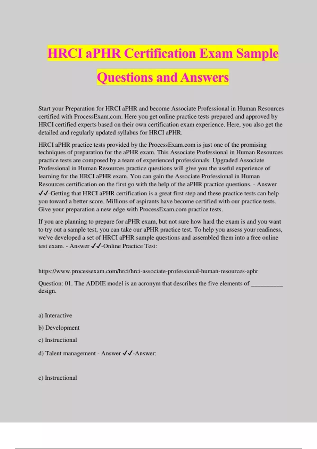 HRCI aPHR Certification Exam Sample Questions and Answers Start your Preparation for HRCI aPHR and become Associate Professional in Human Resources certified with ProcessE. Here you get online practice tests prepared and approved by HRCI certified experts based on their own certification exam experience. Here, you also get the detailed and regularly updated syllabus for HRCI aPHR. HRCI aPHR practice tests provided by the ProcessE is just one of the promising techniques of preparation for the aPHR exam. This Associate Professional in Human Resources practice tests are composed by a team of experienced professionals. Upgraded Associate Professional in Human Resources practice questions will give you the useful experience of learning for the HRCI aPHR exam. You can gain the Associate Professional in Human Resources certification on the first go with the help of the aPHR practice questions. - Answer ️️ -Getting that HRCI aPHR certification is a great first step and these practice tests can help you toward a better score. Millions of aspirants have become certified with our practice tests. Give your preparation a new edge with ProcessE practice tests. If you are planning to prepare for aPHR exam, but not sure how hard the exam is and you want to try out a sample test, you can take our aPHR practice test. To help you assess your readiness, we've developed a set of HRCI aPHR sample questions and assembled them into a free online test exam. - Answer ️️ -Online Practice Test: Question: 01. The ADDIE model is an acronym that describes the five elements of __________ design. a) Interactive b) Development c) Instructional d) Talent management - Answer ️️ -Answer: c) Instructional Question: 02. Which of the following terms refers to collapsing multiple pay ranges into a single- wide pay range? a) Wide banding b) Pay compression c) Green circle rates d) Broadbanding - Answer ️️ -Answe