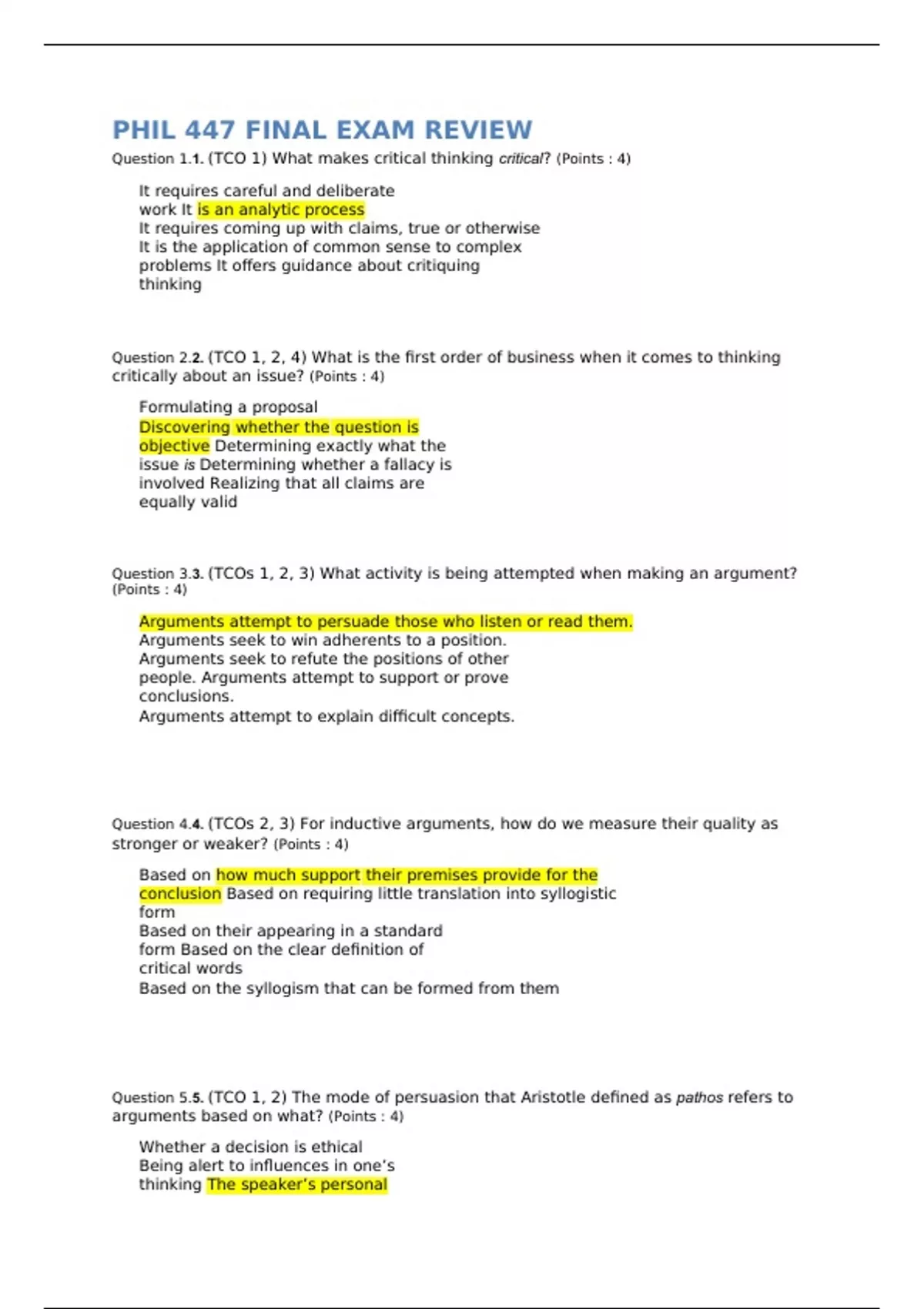 Question 1.1. (TCO 1) What makes critical thinking critical? (Points : 4) It requires careful and deliberate work It is an analytic process It requires coming up with claims, true or otherwise It is the application of common sense to complex problems It offers guidance about critiquing thinking Question 2.2. (TCO 1, 2, 4) What is the first order of business when it comes to thinking critically about an issue? (Points : 4) Formulating a proposal Discovering whether the question is objective Determining exactly what the issue is Determining whether a fallacy is involved Realizing that all claims are equally valid Question 3.3. (TCOs 1, 2, 3) What activity is being attempted when making an argument? (Points : 4) Arguments attempt to persuade those who listen or read them. Arguments seek to win adherents to a position. Arguments seek to refute the positions of other people. Arguments attempt to support or prove conclusions. Arguments attempt to explain difficult concepts. Question 4.4. (TCOs 2, 3) For inductive arguments, how do we measure their quality as stronger or weaker? (Points : 4) Based on how much support their premises provide for the conclusion Based on requiring little translation into syllogistic form Based on their appearing in a standard form Based on the clear definition of critical words Based on the syllogism that can be formed from them Question 5.5. (TCO 1, 2) The mode of persuasion that Aristotle defined as pathos refers to arguments based on what? (Points : 4) Whether a decision is ethical Being alert to influences in one’s thinking The speaker’s personal attributes The audience’s emotions Using information and reasoning Question 6.6. (TCO 6) What is a likely reason for having trouble identifying a conclusion in what you hear or read? (Points : 4) There are too many rhetorical claims There is not enough background information The premise introduces a consideration that runs counter to common sense The conventions of argument are not being followed It could be that the passage is not an argument at all Question 7.7. (TCOs 6, 7, 8, 9) Which of the five items below is usually NOT a part of a good argumentative essay? (Points : 4) A statement of one's position on the issue Arguments that support one's position on the issue Rebuttals of arguments that support contrary positions on the issue An author's claim to speak with respected expertise based on qualifications or experience A statement of the issue Question 8.8. (TCOs 6, 8, 9) What is grouping ambiguity? (Points : 4) When one arbitrarily classifies people as a group for unclear purposes When people share an affinity that is not obvious When it is not clear whether a word is being used to refer to a group or to the individuals within a group When an author or speaker seeks a group to blame as a scapegoat When labeling classifications of people with epithets Question 9.9. (TCOs 2, 6, 7, 8) Which of the following would suggest a lack of credibility in a claim? (Points : 4) When it is accompanied by other claims that have credibility The claim conflicts with what we have observed When the person presenting the claim has something to gain by our believing it When it brings something we have not learned before When it comes from an interested party Question 10.10. (TCOs 1, 6, 7, 9) What is the purpose of the rhetorical device called a euphemism? (Points : 4) To replace ambiguous terms with clearer ones To hide the agenda of interested parties To replace another term with a neutral or positive expression instead of one with negative associations To replace vague terms with others that communicate more information To replace other expressions with new ones that are expected to be more acceptable Question 11.11. (TCOs 1, 7) What is the purpose of the rhetorical device called hyperbole? (Points : 4) Synonym for euphemism To bring humor to a difficult analysis Exaggerating for effect Sarcastic claim Based on unwarranted assumptions Question 12.12. (TCOs 1, 2) What is the personal ad hominem fallacy? (Points : 4) Attacking an argument based on the personal shortcomings of the one making the argument The status given to an argument based on the fame and good reputation of the originating person Attacking an argument based on the confusion of what the author has presented before Attacking an argument because of who presented it Attributing added value to an argument based on who has presented it Question 13.13. (TCOs 6, 7, 8) To the overall topic of burden of proof, what is the purpose of the rule called affirmative/negative plausibility? (Points : 4) Other things being equal, the burden of proof falls automatically on those supporting it affirmatively. Other things being equal, the burden of proof is shared by all parties that have a shared interest in the outcome. Other things being equal, the burden of proof rests with the parties with the most to lose. Other things being equal, the burden of proof rests with neither party automatically. Other things being equal, the first decision must be who must bear the burden of proof. Question 14.14. (TCOs 1, 2) What is a standard-form categorical claim? (Points : 4) The claim that the burden of proof must be shared because the evidence is too weak and indirect. A claim based on the primary documents of early philosophers. A claim that strictly follows Aristotle’s method. A claim that relies upon the orderly processes of biology. A claim that results from putting names or descriptions of classes into one of the AEIO forms. Question 15.15. (TCOs 3, 4) What is the purpose of a Venn Diagram? (Points : 4) To give a graphic illustration of standard-form claims To show how nouns and noun phrases relate To demonstrate the orderly processes of biology To show the primary characteristics of things