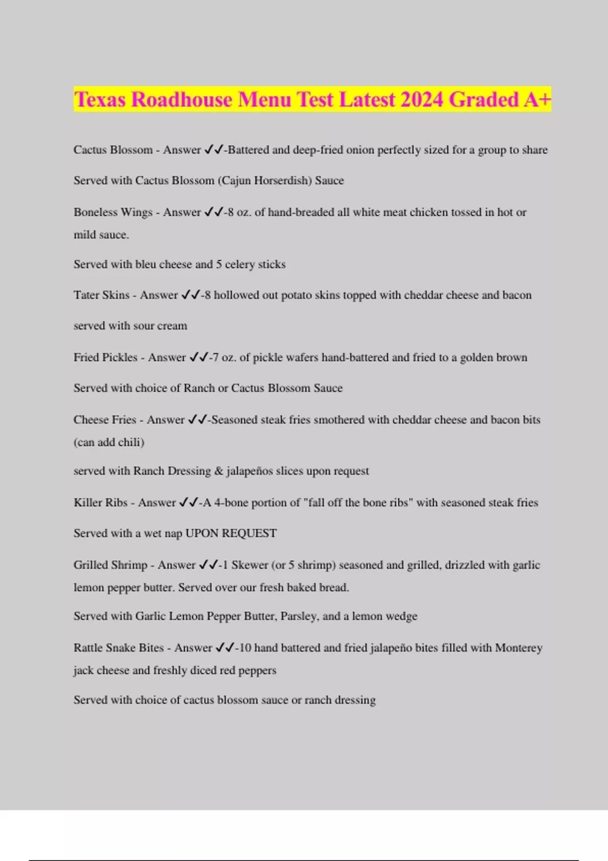 Texas Roadhouse Menu Test Latest 2024 Graded A+ Cactus Blossom - Answer ️️ -Battered and deep-fried onion perfectly sized for a group to share Served with Cactus Blossom (Cajun Horserdish) Sauce Boneless Wings - Answer ️️ -8 oz. of hand-breaded all white meat chicken tossed in hot or mild sauce. Served with bleu cheese and 5 celery sticks Tater Skins - Answer ️️ -8 hollowed out potato skins topped with cheddar cheese and bacon served with sour cream Fried Pickles - Answer ️️ -7 oz. of pickle wafers hand-battered and fried to a golden brown Served with choice of Ranch or Cactus Blossom Sauce Cheese Fries - Answer ️️ -Seasoned steak fries smothered with cheddar cheese and bacon bits (can add chili) served with Ranch Dressing & jalapeños slices upon request Killer Ribs - Answer ️️ -A 4-bone portion of "fall off the bone ribs" with seasoned steak fries Served with a wet nap UPON REQUEST Grilled Shrimp - Answer ️️ -1 Skewer (or 5 shrimp) seasoned and grilled, drizzled with garlic lemon pepper butter. Served over our fresh baked bread. Served with Garlic Lemon Pepper Butter, Parsley, and a lemon wedge Rattle Snake Bites - Answer ️️ -10 hand battered and fried jalapeño bites filled with Monterey jack cheese and freshly diced red peppers Served with choice of cactus blossom sauce or ranch dressing Combo Appetizer - Answer ️️ -SHAREABLE! Combo of 4 oz of boneless wings (mild or hot), 5 rattle snake bites, and 4 potato skins served with the choice of 2: cactus blossom sauce, bleu cheese or ranch dressing and sour cream Texas Red Chili - Answer ️️ -Mild homemade chili. Topped with cheddar cheese and red onions and served with crackers House Salad - Answer ️️ -Mixture of iceberg lettuce and romaine lettuce, carrots and red cabbage topped with tomato, eggs, cheddar cheese, and 5 HOMEMADE croutons Choice of dressing on the side Caesar Salad - Answer ️️ -Romaine lettuce tossed with our homed Caesar dressing and 5 HOMEMADE croutons and topped with fresh Parmesan cheese Grilled Chicken Salad - Answer ️️ -Crisp salad greens topped with an 8 oz. marinated and grilled chicken breast, jack cheese, egg,