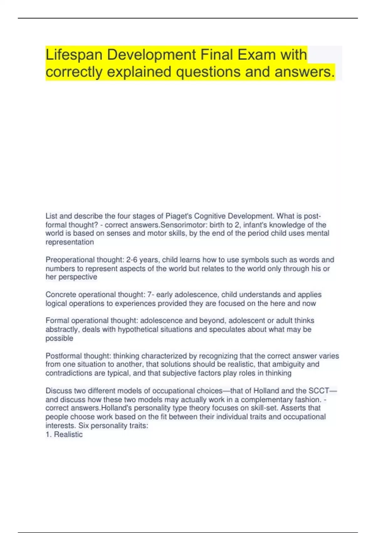 Lifespan Development Final Exam with correctly explained questions and answers. List and describe the four stages of Piaget's Cognitive Development. What is post-formal thought? - correct answers.Sensorimotor: birth to 2, infant's knowledge of the world is based on senses and motor skills, by the end of the period child uses mental representation Preoperational thought: 2-6 years, child learns how to use symbols such as words and numbers to represent aspects of the world but relates to the world only through his or her perspective Concrete operational thought: 7- early adolescence, child understands and applies logical operations to experiences provided they are focused on the here and now Formal operational thought: adolescence and beyond, adolescent or adult thinks abstractly, deals with hypothetical situations and speculates about what may be possible Postformal thought: thinking characterized by recognizing that the correct answer varies from one situation to another, that solutions should be realistic, that ambiguity and contradictions are typical, and that subjective factors play roles in thinking Discuss two different models of occupational choices—that of Holland and the SCCT—and discuss how these two models may actually work in a complementary fashion. - correct answers.Holland's personality type theory focuses on skill-set. Asserts that people choose work based on the fit between their individual traits and occupational interests. Six personality traits: 1. Realistic 2. Investigative (thought, analytical approaches, explore, knowledge, ideas, not social) = biologist, chemist, dentist, vegetarian, programmer 3. Artistic (literary, musical, artistic, emotional, creative, open) = artist, musician, poet, interior designer, writer 4. Social (train, inform, educate, help, supportive, avoid technical skills, empathy, relationships) = social work, counseling, police officer, LPN 5. Enterprising (verbally skilled, persuasive, direct, leader, dominant) = lawyer, business executive, politician, TV producer 6. Conventional (rules and routines, provide order or direct structure, self control, respect power and status, punctual, orderly) = bank teller, clerk typist, cashier, data entry Albert Bandura's social cognitive career theory (SCCT): focuses on self-efficacy with respect to occupation. By means of the self system, individuals exercise control over their thoughts, feelings, and actions. Among the beliefs with which an individual evaluates the control over his/her actions and environment, self-efficacy beliefs are the most influential predictor of human behavior. The level and strength of self-efficacy will determine: whether coping behavior will be initiated, how much effort will result, and how long the effort will be sustained in the face of obstacles. Self efficacy is derived from 4 most influential sources: 1. Personal performance (Accomplishments - previous successes or failures) - Most influential 2. Vicarious experience (watching others, modeling, mentoring 3. Verbal persuasion (verbal encouragement or discouragement 4. Physiological and emotional factors (perceptions of stress react List and describe Erikson's eight stages of Psychosocial Development. - correct answers.1. Trust vs. Mistrust (Infancy): When parents consistently respond to the newborns needs, results in HOPE. 2. Autonomy vs. Shame and Doubt (1-3yrs): Understanding that the child can control his/her actions counteracts with doubt and shame, results in WILL. 3. Initiative vs. Guilt (3-6yrs): Ones initiative may clash with goals of others, results in PURPOSE. 4. Industry vs. Inferiority (school age 5-12): Mastery comes from success and recognition, accepting of the course of ones life, results in COMPETENCY. 5. Ego Identity vs. Role confusion (adolescence): Exploration of different paths to attain a healthy identity, results in FIDELITY. 6. Intimacy vs. Isolation (young adult 18-40): Form positive, close relationships with others, results in LOVE.