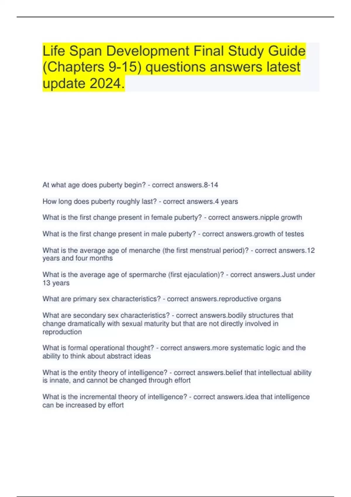 Life Span Development Final Study Guide (Chapters 9-15) questions answers latest update 2024. At what age does puberty begin? - correct answers.8-14 How long does puberty roughly last? - correct answers.4 years What is the first change present in female puberty? - correct e growth What is the first change present in male puberty? - correct h of testes What is the average age of menarche (the first menstrual period)? - correct answers.12 years and four months What is the average age of spermarche (first ejaculation)? - correct answers.Just under 13 years What are primary sex characteristics? - correct ductive organs What are secondary sex characteristics? - correct y structures that change dramatically with sexual maturity but that are not directly involved in reproduction What is formal operational thought? - correct systematic logic and the ability to think about abstract ideas What is the entity theory of intelligence? - correct f that intellectual ability is innate, and cannot be changed through effort What is the incremental theory of intelligence? - correct that intelligence can be increased by effort What is considered secondary education? - correct tionally grades 7 through 12 (after primary education, before tertiary) What is a secular trend? - correct ces in growth and maturation that result from modern nutrition What is the function of pituitary glands? - correct l the hypothalamus that puberty should begin What are adrenal glands? - correct glands, located above the kidneys, that produce hormones in response to the signals of the pituitary What are the four arenas of identity formation? - correct ious, political, vocational, sexual Which type of parenting can "boomerang," resulting in adolescents who learn to deceive their parents? - correct ritarian Compared to when they were children, many adolescents are _____. - correct self- confident Which statement does NOT reflect how culture and gender influence drug use? - correct ettes, alcohol, and other drugs can impact girls' development more than boys' development According to Dunphy, the third step in the sequence of male-female relationships during childhood and adolescence is the development of _____. - correct mixed- sex groups of the advanced members of the crowd What are all the steps in Dunphy's stages of male- female relationships? - correct answers.1. Groups of friends, exclusively one sex or the other. 2. A loose association of girls and boys, with public interactions within a group. 3. Small mixed- sex groups of advanced members of the crowd. 4. Formation of couples, with private intimacies In one detailed study, the teens MOST at risk for sexual violence and STIs had _____. - correct same- sex and opposite- sex partners Most drug use begins _____. - correct social use Several suicides within the same group of people in a brief period are called _____ suicides. - correct er According to Erikson, adolescents are in the stage of _____. - correct ity versus role confusion