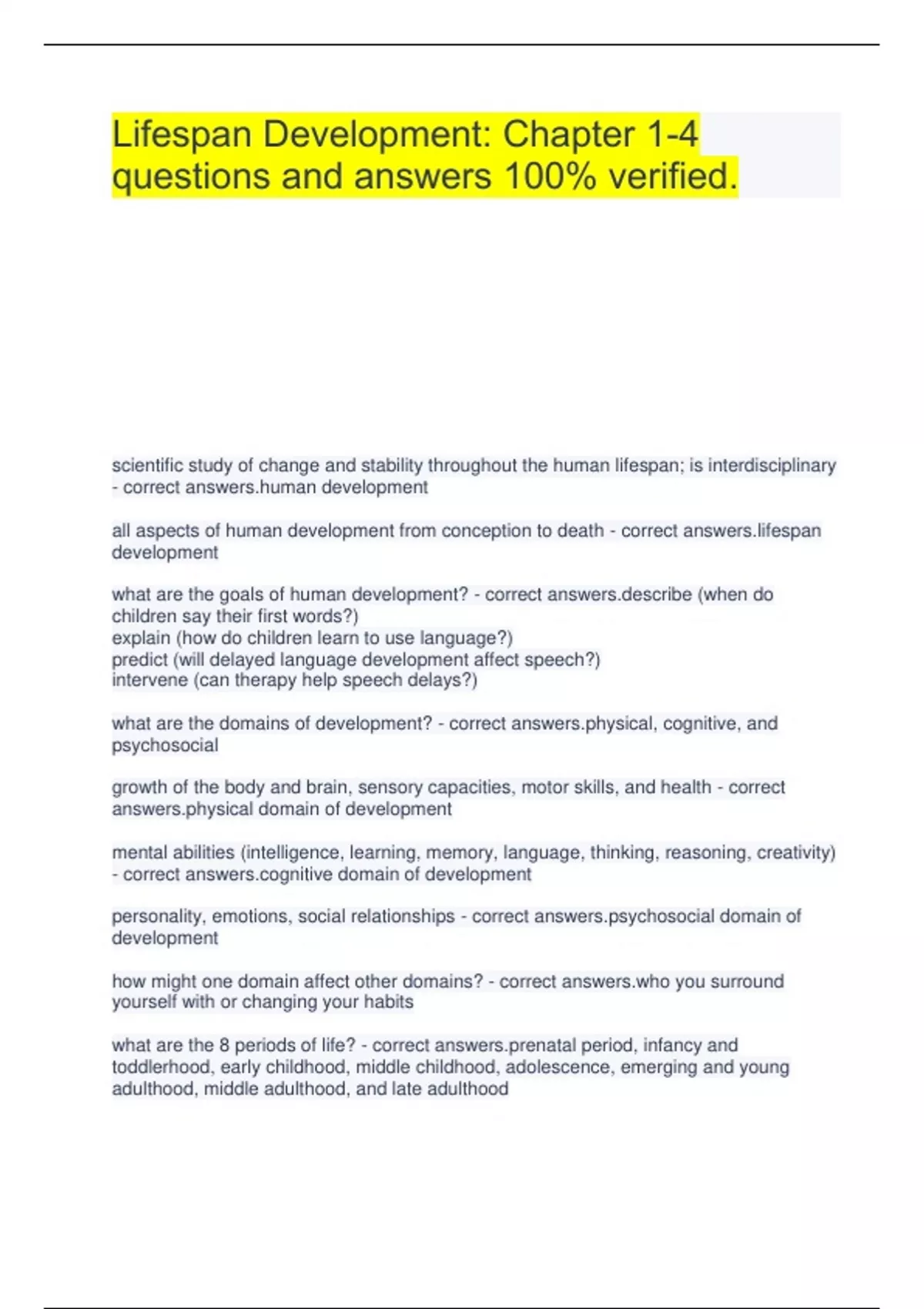 Lifespan Development: Chapter 1-4 questions and answers 100% verified. scientific study of change and stability throughout the human lifespan; is interdisciplinary - correct development all aspects of human development from conception to death - correct pan development what are the goals of human development? - correct ibe (when do children say their first words?) explain (how do children learn to use language?) predict (will delayed language development affect speech?) intervene (can therapy help speech delays?) what are the domains of development? - correct cal, cognitive, and psychosocial growth of the body and brain, sensory capacities, motor skills, and health - correct cal domain of development mental abilities (intelligence, learning, memory, language, thinking, reasoning, creativity) - correct tive domain of development personality, emotions, social relationships - correct osocial domain of development how might one domain affect other domains? - correct you surround yourself with or changing your habits what are the 8 periods of life? - correct tal period, infancy and toddlerhood, early childhood, middle childhood, adolescence, emerging and young adulthood, middle adulthood, and late adulthood inborn trait or characteristics from biological parents (nature) - correct ity world outside the self, learning from experience (nurture) - correct onment unfolding of a universal, natural sequence of changes - correct ation two-generational kinship, economic, and household unit - correct ar family multigenerational kinship network of grandparents, aunts, cousins, etc. - correct ded family income, education, and occupation - correct economic status (SES) a group's total way of life, including customs, traditions, laws, knowledge, beliefs, values, language and physical products - correct re people united by a distinctive culture, ancestry, religion, language, and/or national origin - correct city a social construct with no clear scientific consensus - correct what are the contents of development - correct y, socioeconomic status, culture, ethnicity, and race events that affect many or most people in similar ways; age graded influences (menopause, parenthood); history graded influences (technology, Sept 11) - correct tive unusual events that have a major impact of individual lives (winning the lottery) - correct -normative specific time when a given event, or its absence, has a specific impact on development - correct cal period ________ periods may be more useful than _______ periods because of plasticity - correct tive; critical body/brain capacity for change based on experience (learning to walk again after major trauma) - correct icity set of logically related concepts or statements that seek to describe and explain development, predicts what kinds of behavior might occur, and helps organize and explain - correct y what are the three theoretical issues - correct answers.1. nature vs nurture 2. are humans active or reactive in their development 3. is development continuous or does it occur in stages emphasize quantitative change (numerical) - correct nuous emphasize qualitative change (hair color, change in values) - correct s unconscious forces, how our mind is shaped by unconscious forces - correct oanalyst long lasting change in behavior based on experience or adaption to the environment - correct ing how thinking occurs, thought process - correct tive importance social context in development - correct xtual behavior evolving overtime/hormones affect behavior - correct tionary/sociobiological psychosexual development; unconscious force; first 6 years is most important for developing; believed that people are born with biological drives that must be redirected to make it possible to live in society - correct answers.Sigmund Freud what are the three parts of a personality - correct , ego, and superego demanding, seek gratification/pleasure (ex. when babies want something) - correct gradually develops over first year; voice of reason; balances the id - correct early childhood (5 to 6); your conscious; makes you feel guilty - correct ego what are the five stages of development - correct , anal, phallic, latency, and genital sucking and feeding; from birth to 12-18 months - correct potty training; 12-18 months to 3 years - correct attachment to parents; 3 to 6 years old - correct ic socialization; 6 years old to puberty - correct cy