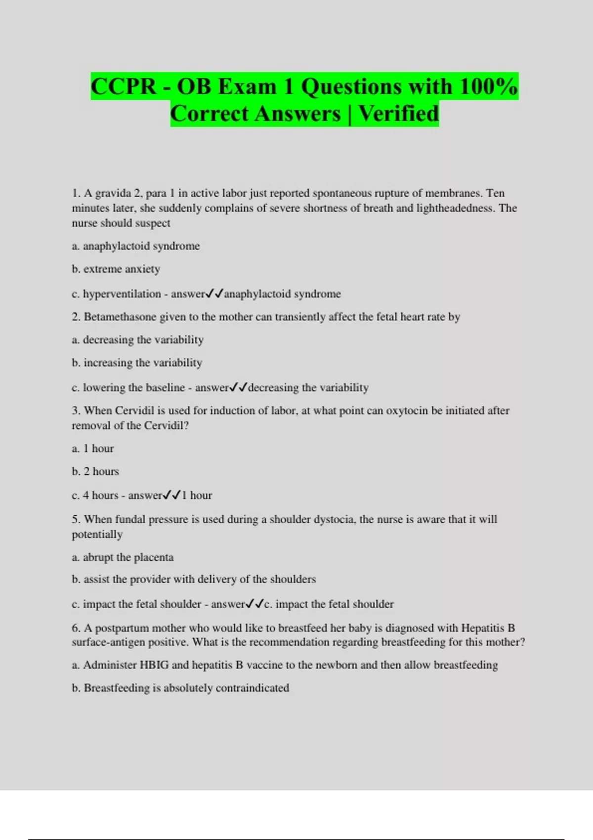 CCPR - OB Exam 1 Questions with 100% Correct Answers | Verified 1. A gravida 2, para 1 in active labor just reported spontaneous rupture of membranes. Ten minutes later, she suddenly complains of severe shortness of breath and lightheadedness. The nurse should suspect a. anaphylactoid syndrome b. extreme anxiety c. hyperventilation - answeranaphylactoid syndrome 2. Betamethasone given to the mother can transiently affect the fetal heart rate by a. decreasing the variability b. increasing the variability c. lowering the baseline - answerdecreasing the variability 3. When Cervidil is used for induction of labor, at what point can oxytocin be initiated after removal of the Cervidil? a. 1 hour b. 2 hours c. 4 hours - answer1 hour 5. When fundal pressure is used during a shoulder dystocia, the nurse is aware that it will potentially a. abrupt the placenta b. assist the provider with delivery of the shoulders c. impact the fetal shoulder - answerc. impact the fetal shoulder 6. A postpartum mother who would like to breastfeed her baby is diagnosed with Hepatitis B surface-antigen positive. What is the recommendation regarding breastfeeding for this mother? a. Administer HBIG and hepatitis B vaccine to the newborn and then allow breastfeeding b. Breastfeeding is absolutely contraindicated c. Pump and discard milk for 1 week following vaccine administration to the newborn - answera. Administer HBIG and hepatitis B vaccine to the newborn and then allow breastfeeding 7. Stimulation of the sympathetic nervous system causes the fetal heart rate to a. decrease b. increase c. remain the same - answerincrea