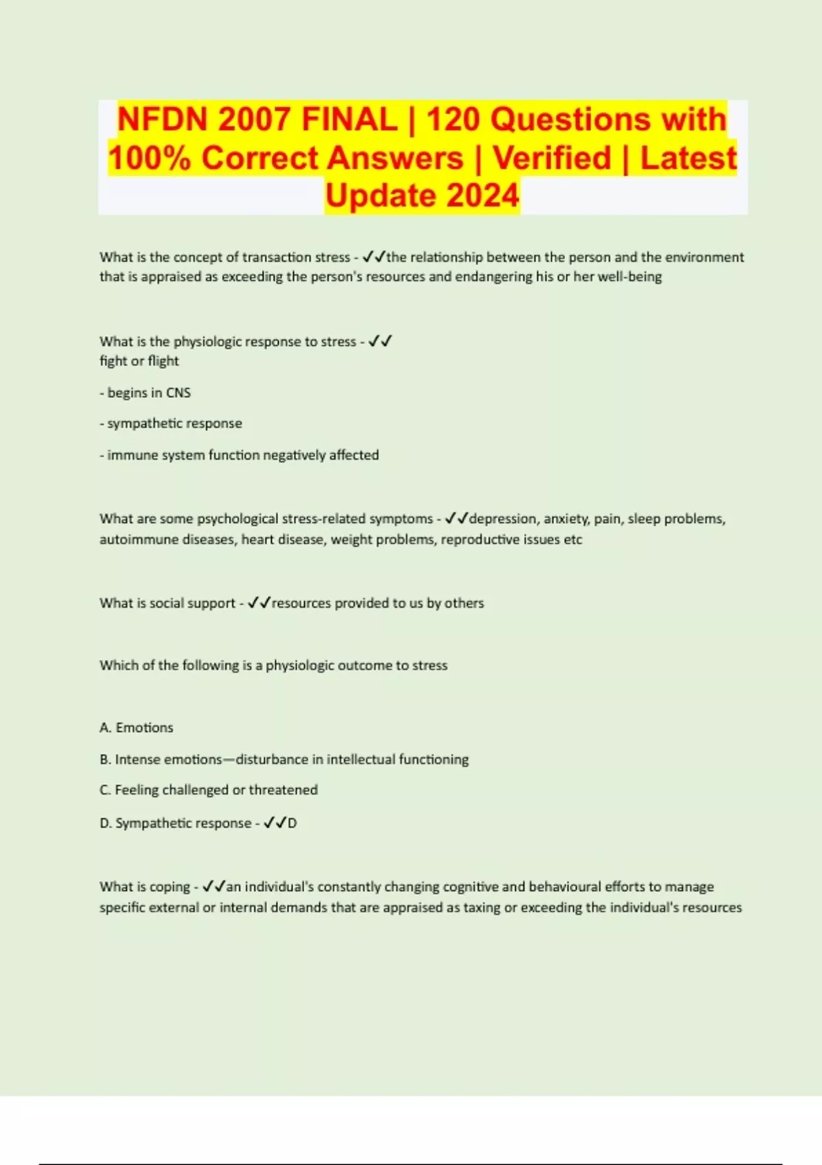 What is the concept of transaction stress - the relationship between the person and the environment that is appraised as exceeding the person's resources and endangering his or her well-being What is the physiologic response to stress - fight or flight - begins in CNS - sympathetic response - immune system function negatively affected What are some psychological stress-related symptoms - depression, anxiety, pain, sleep problems, autoimmune diseases, heart disease, weight problems, reproductive issues etc What is social support - resources provided to us by others Which of the following is a physiologic outcome to stress