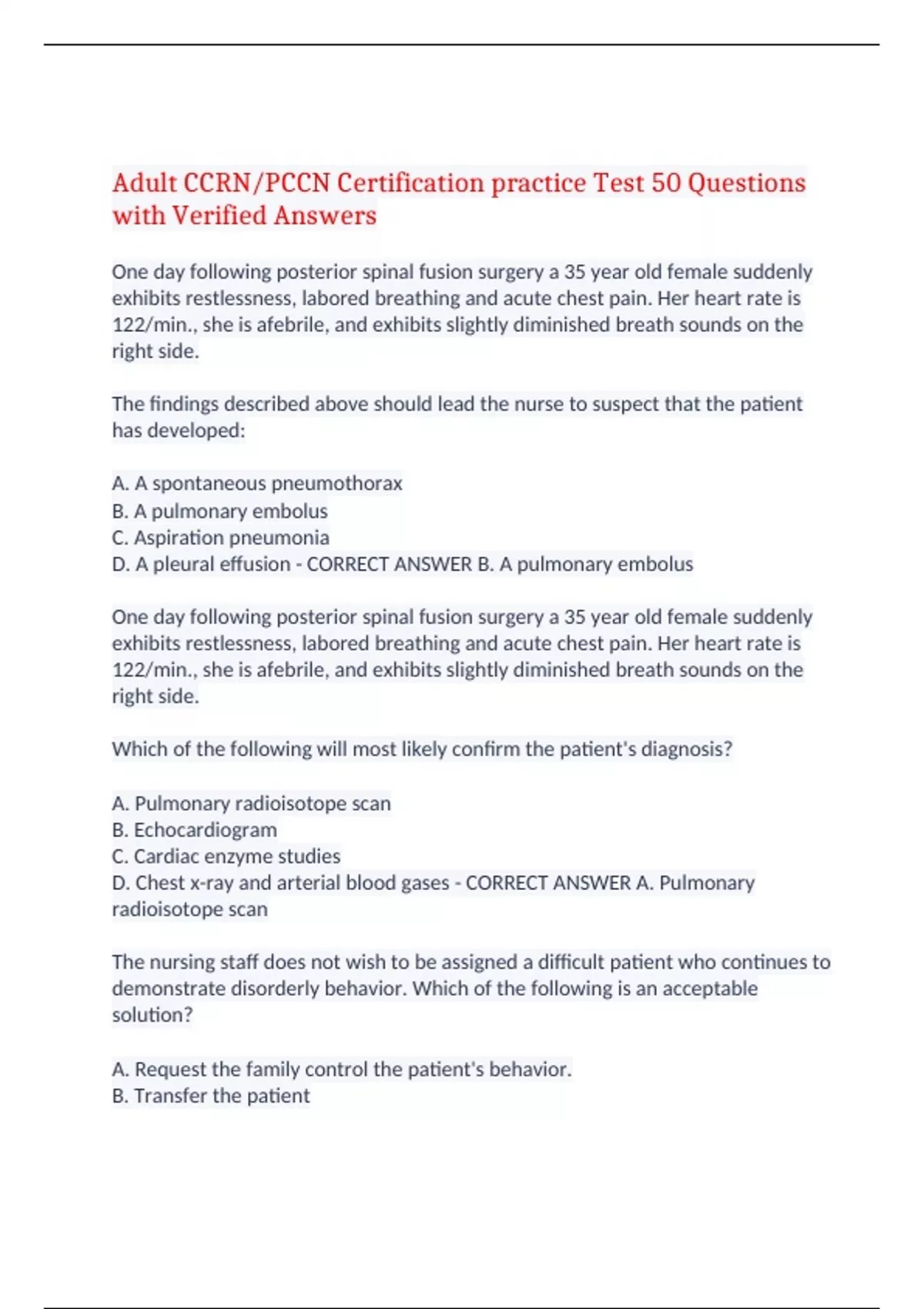 Adult CCRN/PCCN Certification practice Test 50 Questions with Verified Answers One day following posterior spinal fusion surgery a 35 year old female suddenly exhibits restlessness, labored breathing and acute chest pain. Her heart rate is 122/min., she is afebrile, and exhibits slightly diminished breath sounds on the right side. The findings described above should lead the nurse to suspect that the patient has developed: A. A spontaneous pneumothorax B. A pulmonary embolus C. Aspiration pneumonia D. A pleural effusion - CORRECT ANSWER B. A pulmonary embolus One day following posterior spinal fusion surgery a 35 year old female suddenly exhibits restlessness, labored breathing and acute chest pain. Her heart rate is 122/min., she is afebrile, and exhibits slightly diminished breath sounds on the right side. Which of the following will most likely confirm the patient's diagnosis? A. Pulmonary radioisotope scan B. Echocardiogram C. Cardiac enzyme studies D. Chest x-ray and arterial blood gases - CORRECT ANSWER A. Pulmonary radioisotope scan The nursing staff does not wish to be assigned a difficult patient who continues to demonstrate disorderly behavior. Which of the following is an acceptable solution? A. Request the family control the patient's behavior. B. Transfer the patient C. The patient assignment should be decided by the Charge Nurse. D. Alternate the patient assignment among the nursing staff. - CORRECT ANSWER D. Alternate the patient assignment among the nursing staff. A patient who is 72 hours postoperative repair of a bowel obstruction suddenly demonstrates shortness of breath and his respiratory rate increases from 22 to 45/min. His SpO2 went from 95% to 88% acutely. An arterial blood gas sample obtained while the patient is receiving oxygen via a nasal cannula at 6L/min reveals the following results: pH 7.40 pCO2 27 pO2 50 A chest x-ray is obtained and a "ground-glass-like appearance" is reported. Auscultation of the lungs reveals diffuse crackles that were not present previously. The findings described above should lead the nurse to believe that the patient has: A. Acute respiratory distress syndrome B. A pulmonary embolus C. A spontaneous pneumothorax D. Aspiration pneumonia - CORRECT ANSWER A. Acute respiratory distress syndrome A patient who is 72 hours postoperative repair of a bowel obstruction suddenly demonstrates shortness of breath and his respiratory rate increases from 22 to 45/min. His SpO2 went from 95% to 88% acutely. An arterial blood gas sample obtained while the patient is receiving oxygen via a nasal cannula at 6L/min reveals the following results: pH 7.40 pCO2 27 pO2 50 A chest x-ray is obtained and a "ground-glass-like appearance" is reported. Auscultation of the lungs reveals diffuse crackles that were not present previously. On admission, your patient's arterial blood gas on room air is: pH 7.23, PaCO2 55, PaO2 90, HCO3 30. The correct arterial blood gas interpretation is: A. Uncompensated metabolic acidosis B. Uncompensated respiratory alkalosis C. Uncompensated respiratory acidosis D. Uncompensated metabolic alkalosis - CORRECT ANSWER C. Uncompensated respiratory acidosis A patient who is 72 hours postoperative repair of a bowel obstruction suddenly demonstrates shortness of breath and his respiratory rate increases from 22 to 45/min. His SpO2 went from 95% to 88% acutely. An arterial blood gas sample obtained while the patient is receiving oxygen via a nasal cannula at 6L/min reveals the following results: pH 7.40 pCO2 27 pO2 50 A chest x-ray is obtained and a "ground-glass-like appearance" is reported. Auscultation of the lungs reveals diffuse crackles that were not present previously. Your patient just received 10 units of banked blood for a GI bleed. You know this will affect the oxyhemoglobin dissociation curve by: A. Shifting it to the right B. Causing a plateau in the curve C. Shifting it to the left D. Causing no change in the curve - CORRECT ANSWER C. Shifting it to the left A patient who is 72 hours postoperative repair of a bowel obstruction suddenly demonstrates shortness of breath and his respiratory rate increases from 22 to 45/min. His SpO2 went from 95% to 88% acutely. An arterial blood gas sample obtained while the patient is receiving oxygen via a nasal cannula at 6L/min reveals the following results: pH 7.40 pCO2 27 pO2 50 A chest x-ray is obtained and a "ground-glass-like appearance" is reported. Auscultation of the lungs reveals diffuse crackles that were not present previously. Your patient is currently on a ventilator with the following settings: AC, FiO2 100%, Rate of 12, Tidal Volume 450, PEEP of 5. His arterial blood gas results are the following: pH 7.36, PaCO2 43, PaO2 56, HCO3 28. Which ventilator parameter do you anticipate changing? A. Decrease the FiO2 B. Increase the tidal volume C. Increase the PEEP D. Increase the rate - CORRECT ANSWER C. Increase the PEEP ARDS is characterized by which of the following: A. Refractory hypercarbia B. Increase in surfactant C. Increased lung compliance D. Shunting - CORRECT ANSWER D. Shunting Rationale: ARDS is characterized by refractory hypoxia, shunting, decreased lung compliance, and decreased surfactant. A 42 y/o woman with a 6 month history of worsening anxiety, heat intolerance, and weight loss presents to the emergency department. Which of the following are indicators of hyperthyroidism? A. Constipation, lower body temperature, and edema B. High T3 and T4 and low TSH. C. Depression, dementia, and reflex changes D. Low T3 and T4 and high TSH - CORRECT ANSWER B. High T3 and T4 and low TSH. Rationale: Constipation, lower body temperature, edema, depression, dementia, reflex changes, low T3, low T4, high TSH are all indicators of hypothyroidism. An elderly man with Type 2 DM comes into the emergency department after spending all day in the mall shopping with his wife. He tells you that his heart is racing and he is sweaty and shaky. What is the best course of action for the nurs
