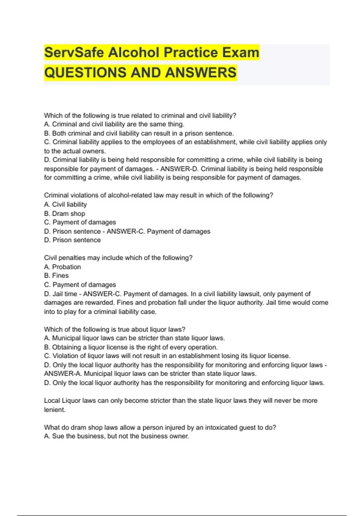 ServSafe Alcohol Practice Exam QUESTIONS AND ANSWERS