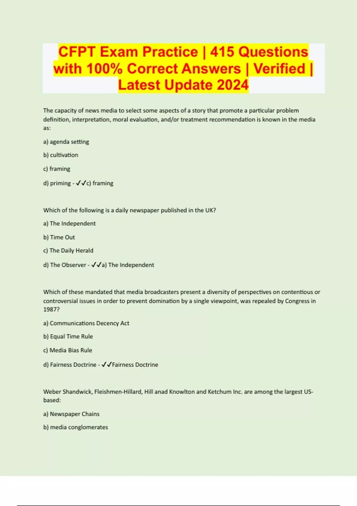CFPT Exam Practice | 415 Questions with 100% Correct Answers | Verified | Latest Update 2024