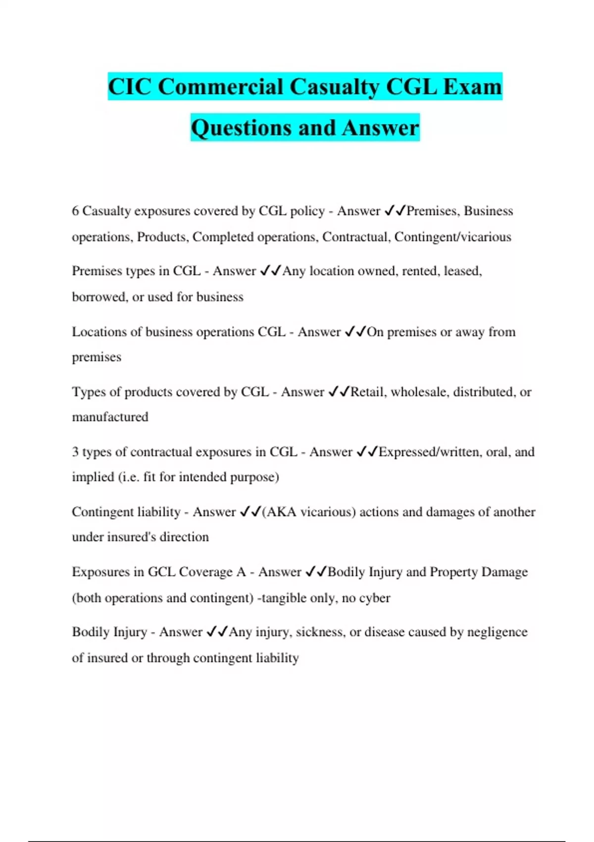 CIC Commercial Casualty CGL Exam Questions and Answer