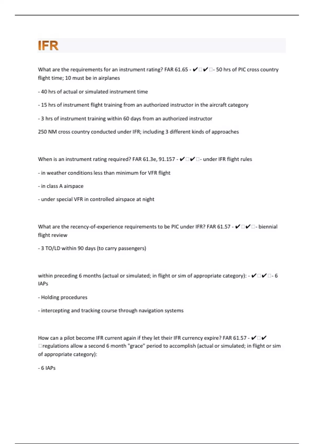What are the requirements for an instrument rating? FAR 61.65 - ️️- 50 hrs of PIC cross country flight time; 10 must be in airplanes - 40 hrs of actual or simulated instrument time - 15 hrs of instrument flight training from an authorized instructor in the aircraft category - 3 hrs of instrument training within 60 days from an authorized instructor 250 NM cross country conducted under IFR; including 3 different kinds of approaches When is an instrument rating required? FAR 61.3e, 91.157 - ️️- under IFR flight rules - in weather conditions less than minimum for VFR flight - in class A airspace - under special VFR in controlled airspace at night What are the recency-of-experience requirements to be PIC under IFR? FAR 61.57 - ️️- biennial flight review - 3 TO/LD within 90 days (to carry passengers) within preceding 6 months (actual or simulated; in flight or sim of appropriate category): - ️️- 6 IAPs - Holding procedures - intercepting and tracking course through navigation systems How can a pilot become IFR current again if they let their IFR currency expire? FAR 61.57 - ️️regulations allow a second 6 month "grace" period to accomplish (actual or simulated; in flight or sim of appropriate category): - 6 IAPs