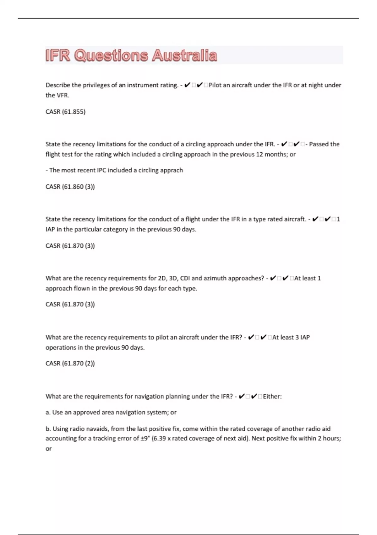 Describe the privileges of an instrument rating. - ️️Pilot an aircraft under the IFR or at night under the VFR. CASR (61.855) State the recency limitations for the conduct of a circling approach under the IFR. - ️️- Passed the flight test for the rating which included a circling approach in the previous 12 months; or - The most recent IPC included a circling apprach CASR (61.860 (3)) State the recency limitations for the conduct of a flight under the IFR in a type rated aircraft. - ️️1 IAP in the particular category in the previous 90 days. CASR (61.870 (3)) What are the recency requirements for 2D, 3D, CDI and azimuth approaches? - ️️At least 1 approach flown in the previous 90 days for each type. CASR (61.870 (3)) What are the recency requirements to pilot an aircraft under the IFR? - ️️At least 3 IAP operations in the previous 90 days. CASR (61.870 (2)) What are the requirements for navigation planning under the IFR? - ️️Either: a. Use an approved area navigation system; or b. Using radio navaids, from the last positive fix, come within the rated coverage of another radio aid accounting for a tracking error of ±9° (6.39 x rated coverage of next aid). Next positive fix within 2 hours;