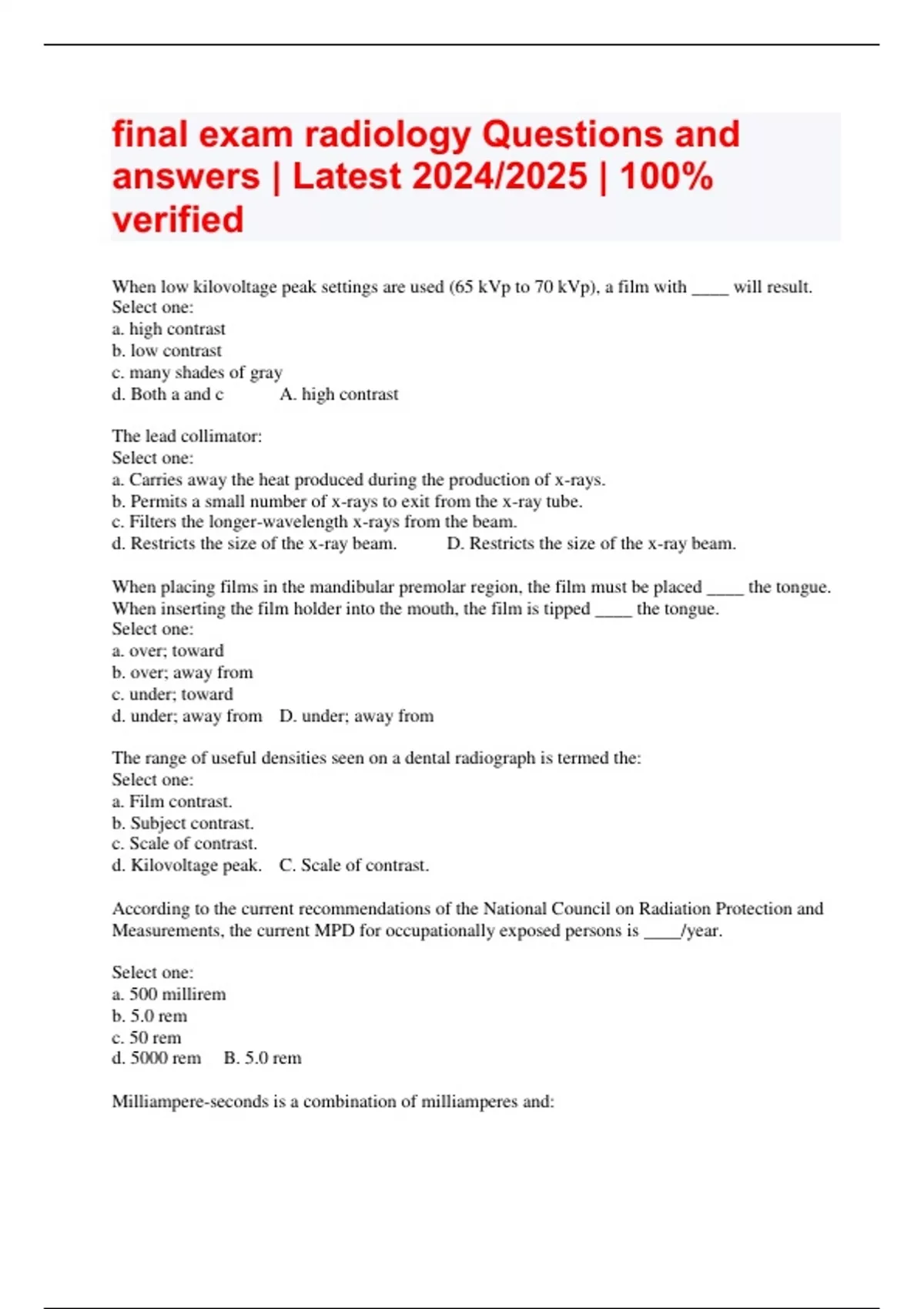 final exam radiology Questions and answers | Latest 2024/2025 | 100% verified