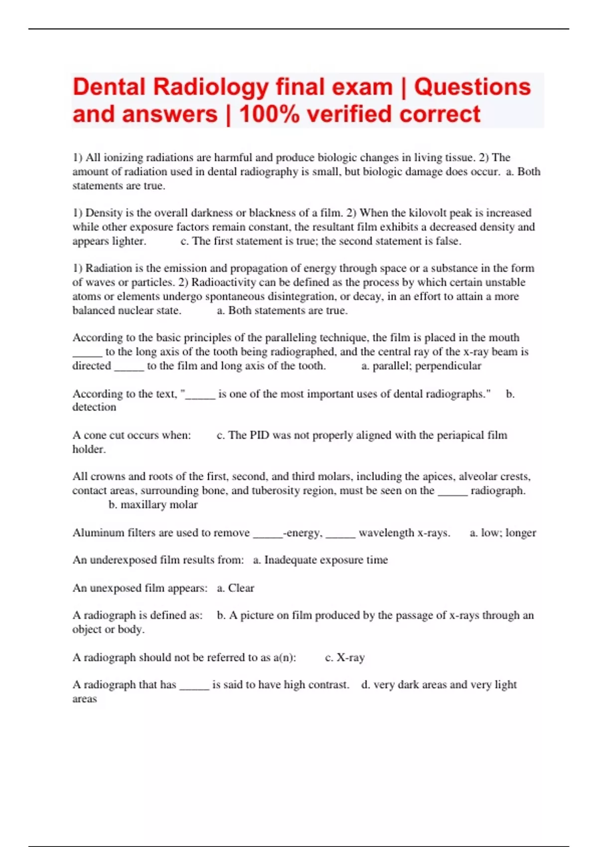 Dental Radiology final exam | Questions and answers | 100% verified correct
