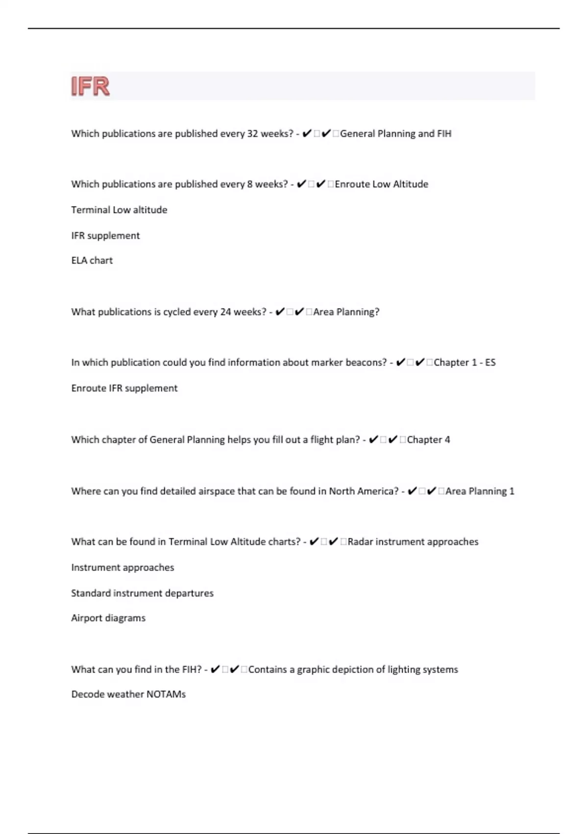 Which publications are published every 32 weeks? - ️️General Planning and FIH Which publications are published every 8 weeks? - ️️Enroute Low Altitude Terminal Low altitude IFR supplement ELA chart What publications is cycled every 24 weeks? - ️️Area Planning? In which publication could you find information about marker beacons? - ️️Chapter 1 - ES Enroute IFR supplement Which chapter of General Planning helps you fill out a flight plan? - ️️Chapter 4 Where can you find detailed airspace that can be found in North America? - ️️Area Planning 1 What can be found in Terminal Low Altitude charts? - ️️Radar instrument approaches Instrument approaches Standard instrument departures Airport diagrams What can you find in the FIH? - ️️Contains a graphic depiction of lighting systems Decode weather NOTAMs