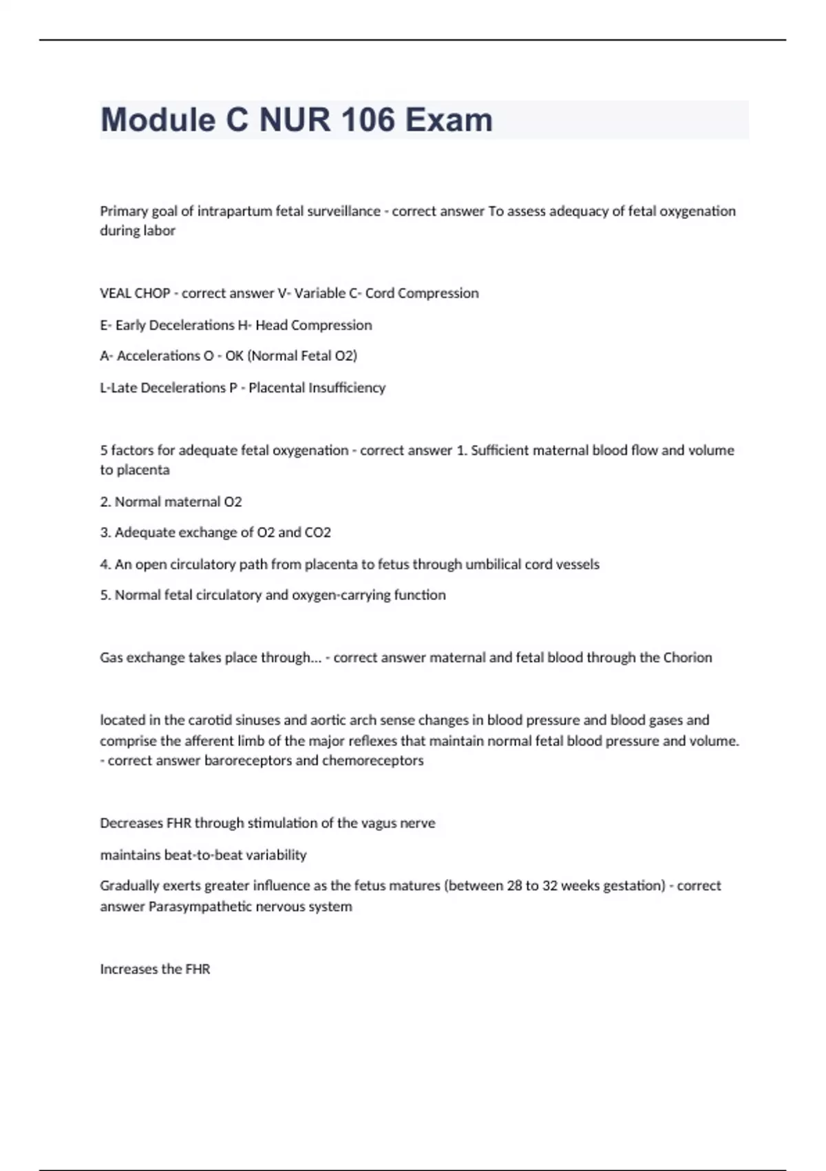 Module C NUR 106 ExamPrimary goal of intrapartum fetal surveillance - correct answer To assess adequacy of fetal oxygenation during labor VEAL CHOP - correct answer V- Variable C- Cord Compression E- Early Decelerations H- Head Compression A- Accelerations O - OK (Normal Fetal O2) L-Late Decelerations P - Placental Insufficiency 5 factors for adequate fetal oxygenation - correct answer 1. Sufficient maternal blood flow and volume to placenta 2. Normal maternal O2 3. Adequate exchange of O2 and CO2 4. An open circulatory path from placenta to fetus through umbilical cord vessels 5. Normal fetal circulatory and oxygen-carrying function Gas exchange takes place through... - correct answer maternal and fetal blood through the Chorion located in the carotid sinuses and aortic arch sense changes in blood pressure and blood gases and comprise the afferent limb of the major reflexes that maintain normal fetal blood pressure and volume. - correct answer baroreceptors and chemoreceptors Decreases FHR through stimulation of the vagus nerve maintains beat-to-beat variability Gradually exerts greater influence as the fetus matures (between 28 to 32 weeks gestation) - correct answer Parasympathetic nervous system Increases the FHR