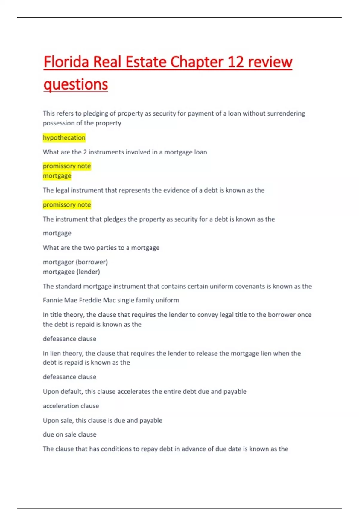 The legal instrument that represents the evidence of a debt is known as the promissory note The instrument that pledges the property as security for a debt is known as the mortgage What are the two parties to a mortgage mortgagor (borrower) mortgagee (lender) The standard mortgage instrument that contains certain uniform covenants is known as the Fannie Mae Freddie Mac single family uniform In title theory, the clause that requires the lender to convey legal title to the borrower once the debt is repaid is known as the defeasance clause In lien theory, the clause that requires the lender to release the mortgage lien when the debt is repaid is known as the defeasance clause Upon default, this clause accelerates the entire debt due and payable acceleration clause Upon sale, this clause is due and payable due on sale clause The clause that has conditions to repay debt in advance of due date is known as the