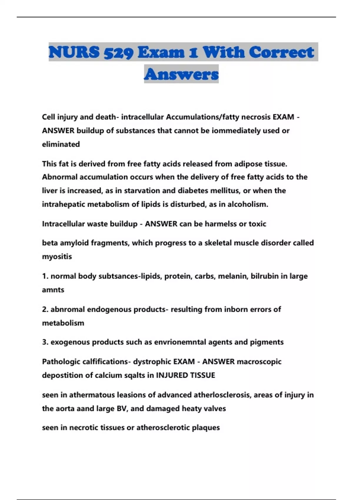 NURS 529 Exam 1 With Corre ct Answer s Cell injury and death- intracellular Accumulations/fatty necrosis EXAM - ANSWER buildup of substances that cannot be iommediately used or eliminated This fat is derived from free fatty acids released from adipose tissue. Abnormal accumulation occurs when the delivery of free fatty acids to the liver is increased, as in starvation and diabetes mellitus, or when the intrahepatic metabolism of lipids is disturbed, as in alcoholism. Intracellular waste buildup - ANSWER can be harmelss or toxic beta amyloid fragments, which progress to a skeletal muscle disorder called myositis 1. normal body subtsances-lipids, protein, carbs, melanin, bilrubin in large amnts 2. abnromal endogenous products- resulting from inborn errors of metabolism 3. exogenous products such as envrionemntal agents and pigments Pathologic calfifications- dystrophic EXAM - ANSWER macroscopic depostition of calcium sqalts in INJURED TISSUE seen in athermatous leasions of advanced atherlosclerosis, areas of injury in the aorta aand large BV, and damaged heaty valves seen in necrotic tissues or atherosclerotic plaques Metastatic. calficication EXAM - ANSWER NORMAL TISSUES results of increased serum calcium lvels hypercalcemia casues are hyperparathyroidism, primary or secondary to phospate restention in renal failure, increased mobilization of calcium from bone in paget disease, cancer with metatstic bone lesions, immoblization, vitamin D intoxicazation Hyperplasia EXAM - ANSWER increase in number of cells Dysplagia EXAM - Lead Toxicity EXAM - ANSWER Flaking pain, lead contaminated dust and soil, root vegetables, water pipes, pottery glazes, newsprint, toys childrens exposed through paint, breathing dust from lead paint, or from playing in contaminated soil can have devastaiing congitive and itelluectual defefcitys, and well as neurobehavioral problems... led to decrease in references of blood lead from 10 to 5 absorbed through GI tract or lungs into blood. a decreasse in calcium, iron, or zinc increases aborption in children, most lead absorbed through LUNGS stored in bone and eliminated in kidneys anemia is cardial sign of toxicity lead colic -acute abdominal pain. a lead line forms along gingival margins can cause diffuse kidney damade, renal failre... leading to hypertension demyelination of cerebral and cerebellar white matter and detah of cortical cedlls peripheral demyelinatinf neuropathy in adults most serious manifestation is acute encephalopathy --s/s n/v, ataxia, sx, papilledema, LOC, coma, screening- use of capillary blood obtained from finger stick to measure free eythrocyte protoporphytin (EP).. levels above 10 should be confirmed with a veous sample Cg4 genetic control of cell function:from genes to proteins - ANSWER Here, we will discuss messenger RNA (mRNA), ribosomal RNA (rRNA), and transfer RNA (tRNA). All three types of RNA are synthesized in the nucleus by RNA polymerase enzymes and then moved into the cytoplasm, where protein synthesis takes place. Messenger RNA carries the instructions for protein synthesis, obtained from the DNA molecule, into the cytoplasm. Transfer RNA reads the instructions and delivers the appropriate amino acids to the ribosome, and ribosomal RNA translates the instructions and provides the machinery needed for protein synthesis. ch 6 screenning, diagnosis, tx: diagnostic methods - ANSWER screening- Screening represents a secondary prevention measure for the early recognition of cancer in an otherwise asymptomatic population.2 Screening can be achieved through observation (e.g., skin, mouth, external genitalia), palpation (e.g., breast, thyroid, rectum and anus, prostate, lymph nodes), and laboratory tests and procedures (e.g., Papanicolaou [Pap] smear, colonoscopy, mammography). For most cancers, stage at presentation is related to curability, with the highest rates reported when the tumor is small and there is no evidence of metastasis. For some tumors, however, metastasis tends to occur early, even from a small primary tumor. Cancers for which current screening or early detection has led to improvement in outcomes include cancers of the breast (mammography), cervix (Pap smear), colon and rectum (rectal examination, fecal occult blood test, and colonoscopy), prostate (prostate-specific antigen [PSA] testing and transrectal ultrasonography), and malignant melanoma (self-examination). Although not as clearly defined, it is recommended that screening for other types of cancers such as cancers of the thyroid, testicles, ovaries, lymph nodes, and oral cavity be done at the time of periodic health examinations. DIAGNOSTIC METHODS Tumor markers are antigens expressed on the surface of tumor cells or substances released from normal cells in response to the presence of tumor.6,42 Some substances, such as hormones and enzymes, that are produced normally by the involved tissue become overexpressed as a result of cancer. Other tumor markers, such as oncofetal proteins, are produced during fetal development and are induced to reappear later in life as a result of benign and malignant neoplasms. Tumor markers are used for screening, establishing prognosis, monitoring treatment, and detecting recurrent disease. A EBP - ANSWER making decisions in healthcare based on scientific dtata that has shown a specifc way of managing disease, patient symptoms, and complatins,