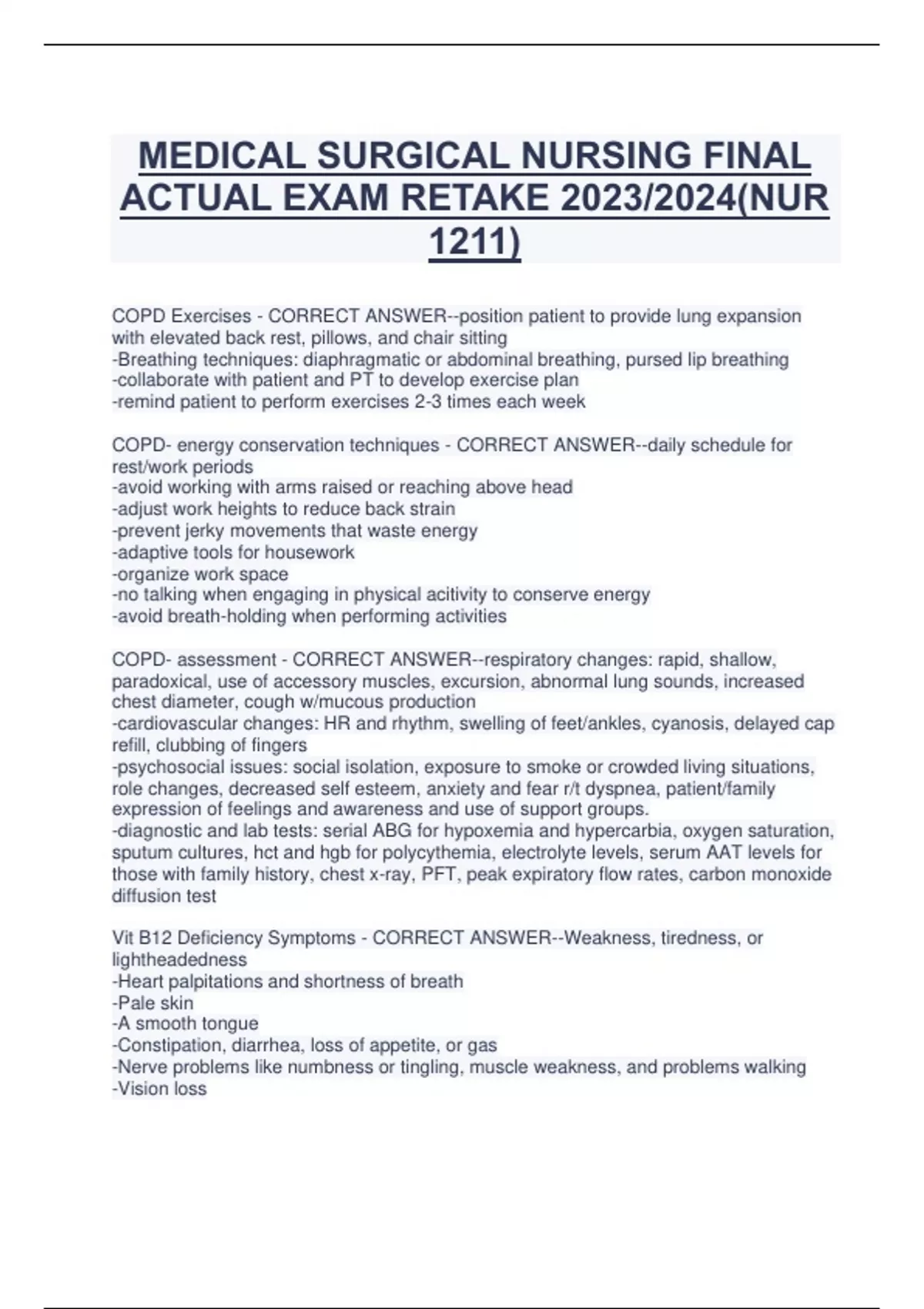 MEDICAL SURGICAL NURSING FINAL ACTUAL EXAM RETAKE 2023/2024(NUR 1211) COPD Exercises - CORRECT ANSWER--position patient to provide lung expansion with elevated back rest, pillows, and chair sitting -Breathing techniques: diaphragmatic or abdominal breathing, pursed lip breathing -collaborate with patient and PT to develop exercise plan -remind patient to perform exercises 2-3 times each week COPD- energy conservation techniques - CORRECT ANSWER--daily schedule for rest/work periods -avoid working with arms raised or reaching above head -adjust work heights to reduce back strain -prevent jerky movements that waste energy -adaptive tools for housework -organize work space -no talking when engaging in physical acitivity to conserve energy -avoid breath-holding when performing activities COPD- assessment - CORRECT ANSWER--respiratory changes: rapid, shallow, paradoxical, use of accessory muscles, excursion, abnormal lung sounds, increased chest diameter, cough w/mucous production -cardiovascular changes: HR and rhythm, swelling of feet/ankles, cyanosis, delayed cap refill, clubbing of fingers -psychosocial issues: social isolation, exposure to smoke or crowded living situations, role changes, decreased self esteem, anxiety and fear r/t dyspnea, patient/family expression of feelings and awareness and use of support groups. -diagnostic and lab tests: serial ABG for hypoxemia and hypercarbia, oxygen saturation, sputum cultures, hct and hgb for polycythemia, electrolyte levels, serum AAT levels for those with family history, chest x-ray, PFT, peak expiratory flow rates, carbon monoxide diffusion test Vit B12 Deficiency Symptoms - CORRECT ANSWER--Weakness, tiredness, or lightheadedness -Heart palpitations and shortness of breath -Pale skin -A smooth tongue -Constipation, diarrhea, loss of appetite, or gas -Nerve problems like numbness or tingling, muscle weakness, and problems walking -Vision loss -Mental problems like depression, memory loss, or behavioral changes Risk factors for Cholelithiasis - CORRECT ANSWER--FEMALE, FAT, FORTY -Being age 40 or older -Being a Native American -Being a Mexican-American -Being overweight or obese -Being sedentary -Being pregnant -Eating a high-fat diet -Eating a high-cholesterol diet -Eating a low-fiber diet -Having a family history of gallstones -Having diabetes -Losing weight very quickly -Taking medications that contain estrogen, such as oral contraceptives or hormone therapy drugs -Having liver disease GI Age-related Changes - CORRECT ANSWER-Stomach-atrophy of gastric mucosa, decrease in HCl acid levels Large intestine-peristalsis decreases and nerve impulses are dulled Pancreas-distention and dilation of pancreatic ducts, calcification of pancreatic vessels occurs with a decrease in lipase production Liver-Decrease in number and size of hepatic cells leads to decreased liver weight. Increase in fibrous tissue. Decreased protein synthesis and changes in enzymes. cholesterol synthesis diminished. Ascites- possible treatments - CORRECT ANSWER--A low-sodium diet and bed rest. -Diuretics. -Removal of ascitic fluid (therapeutic paracentesis) -Sometimes surgery to reroute blood flow (portosystemic shunting) or liver transplantation. -For spontaneous bacterial peritonitis, antibiotics. GERD- Care of Patient - CORRECT ANSWER--Explore patient's meal plan and food preferences -Collaborate with dietician, pt, and family to plan dietary modifications -Limit/eliminate foods that decrease pressure of lower esophageal sphincter and irritate inflamed tissue. -avoid chocolate, peppermint, fatty fried foods, carbonated beverages -eat small meals that aren't spicy or acidic -avoid eating for 3+ hours before bed -eliminate alcohol and tobacco -remain upright after meals 1-2 hours -weight reduction